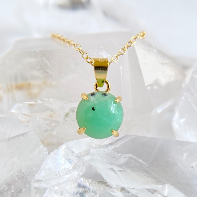 オーストラリア産クリソプレーズ原石を丁寧に磨き上げ、シンプルなネックレスを作りました。 ミルキーグリーンカラーに白色が混じり、黒い点の模様が面白いです。 自分へのご褒美や、大切な人への贈り物にいかがですか。 素材はSV925製・18KGP。高級感のあるK18ゴールド仕上げです。 チェーンはシンプルな小豆の14kgfチェーンを合わせています。 写真のトルソーは9号サイズ、40cmチェーン着用で撮影しています。 商品詳細説明 ○宝石名:天然クリソプレーズ1.42ct ○全長:縦:約8mm、横:約8mm、厚み:約3.5mm(石の大きさ) ○素材:SV925・K18コーティング ○チェーン:14kgf(40cm) ○付属品:アクセサリーケース、品質保証書 こちらもおすすめ! K10 天然ヘミモルファイトネックレス 原石から磨きました! https://arikajewelry.theshop.jp/items/85680694 ※天然石ですのでクラックやインクリュージョンは、天然の証としてお楽しみください。 ※天然石は高熱や急激な温度変化に弱いので、直射日光に長時間当たることや保管場所にご注意下さい。 普段のお手入れは、やわらかい布または革(セーム革)でのからぶきがオススメです。基本的には水で洗うことは避けてください。化粧品、香水、温泉なども直接触れさせない方がいいです。