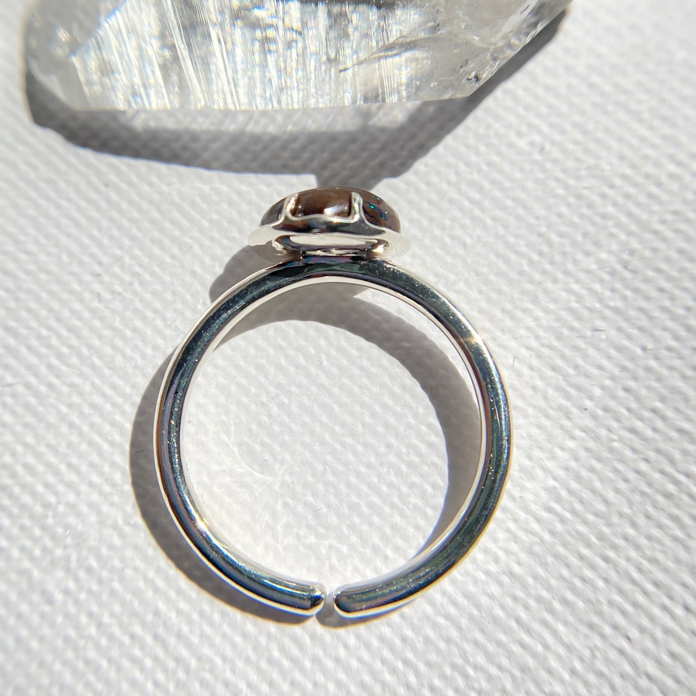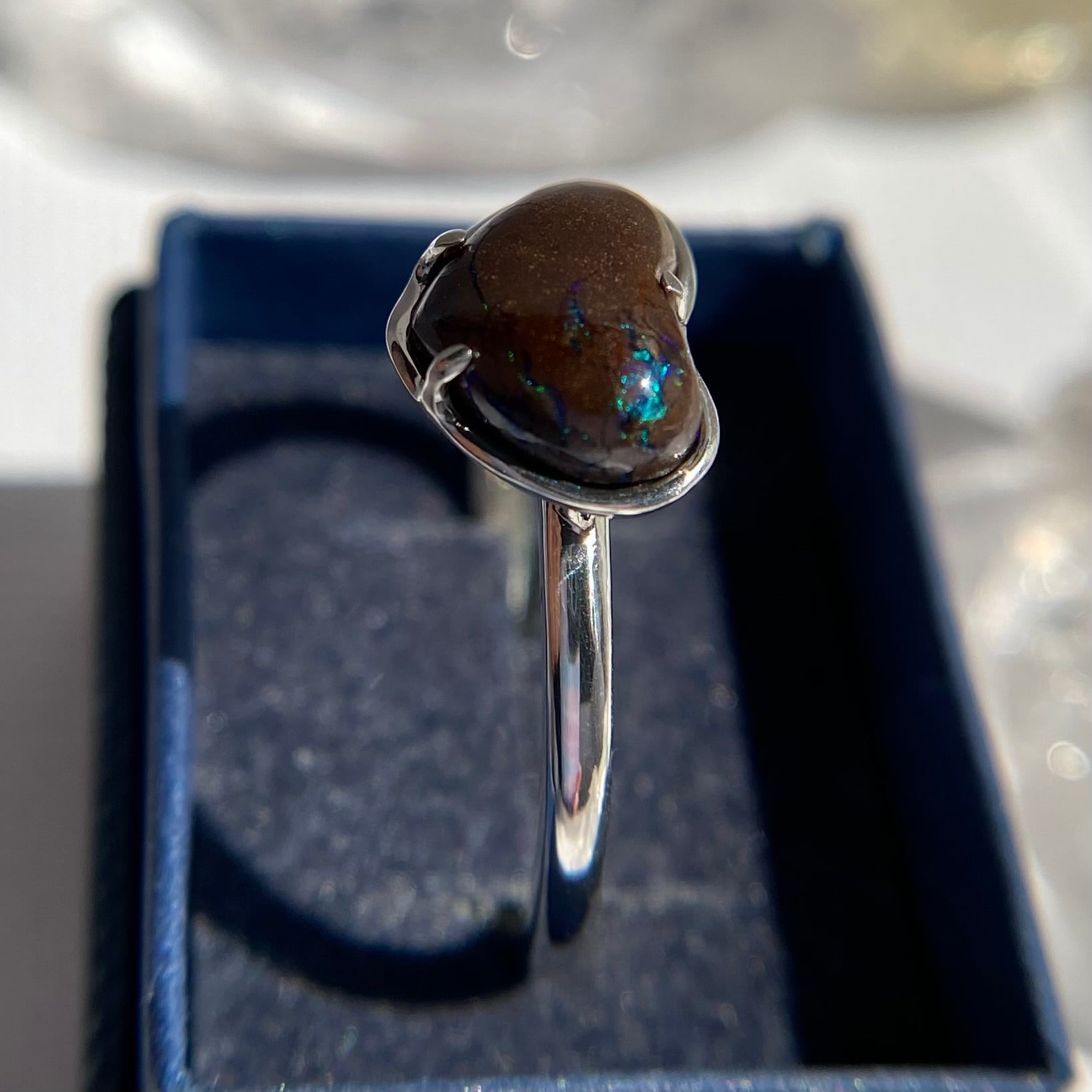 天然オパールは見る角度によって遊色が変わり、楽しい石です。太陽光の下でリングを動かして遊色の変化をお楽しみ下さい。