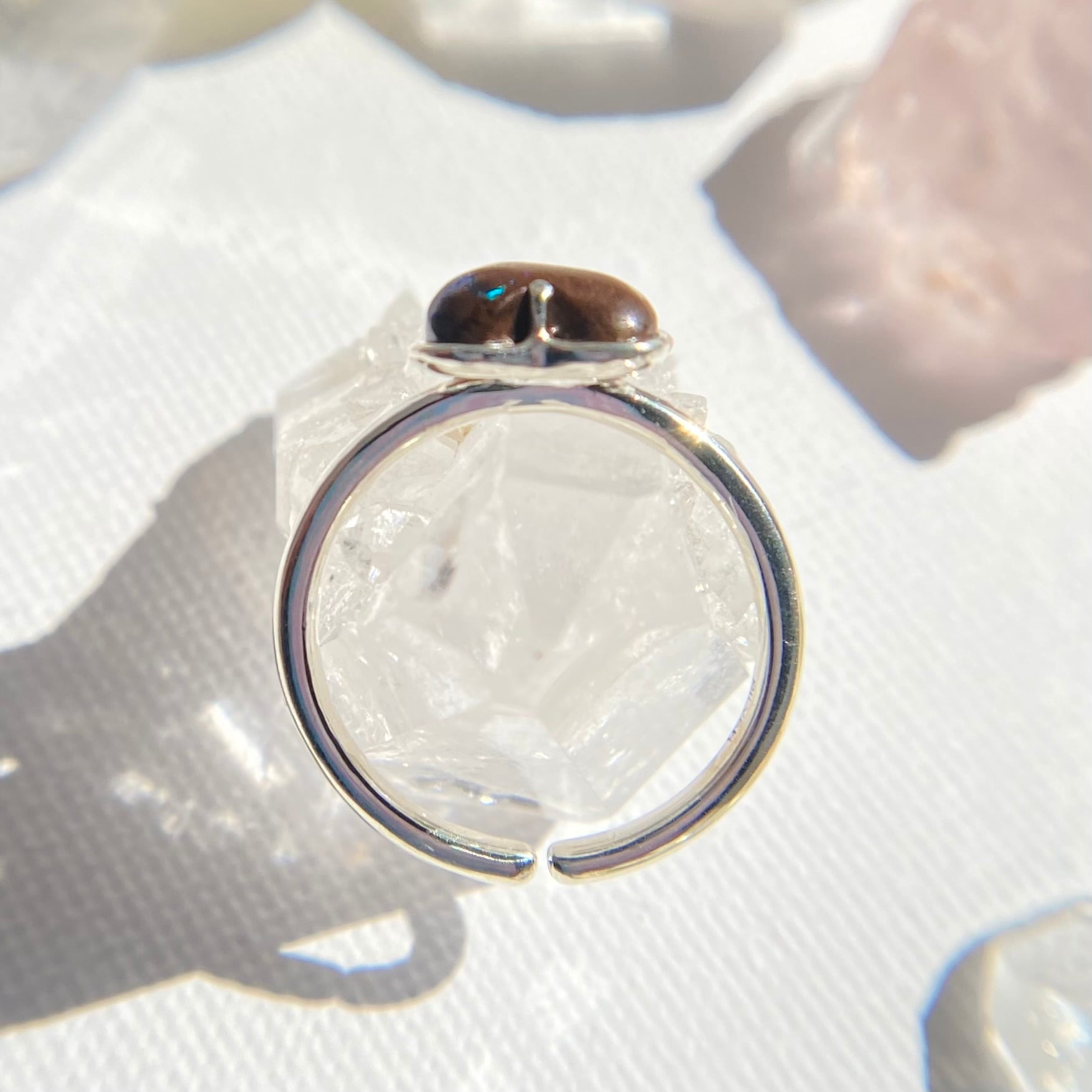 オーストラリア産のボルダーオパール原石を丁寧に磨き上げた、ハンドメイドのフリーサイズリングです。