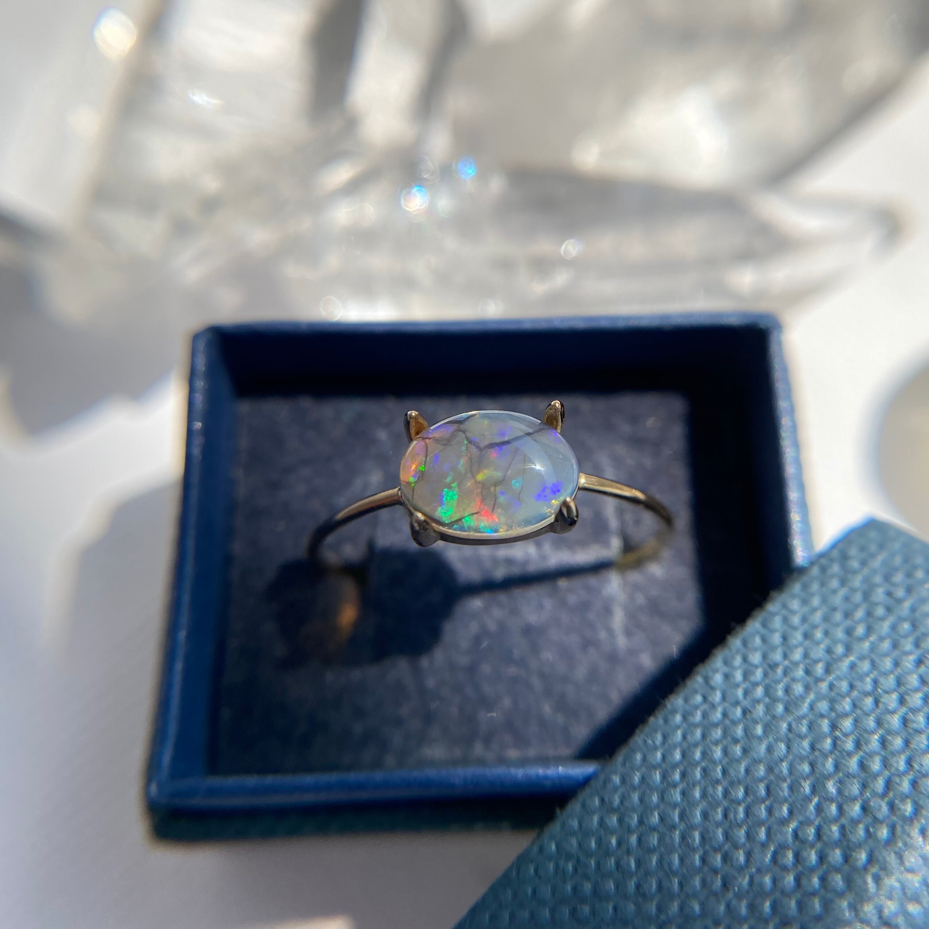 こちらは透明感のあるオパールに赤、水色、緑、青、紫、黄色の遊色が煌めき、ブラックの紋様が神秘的で独特の美しさを放ちます。