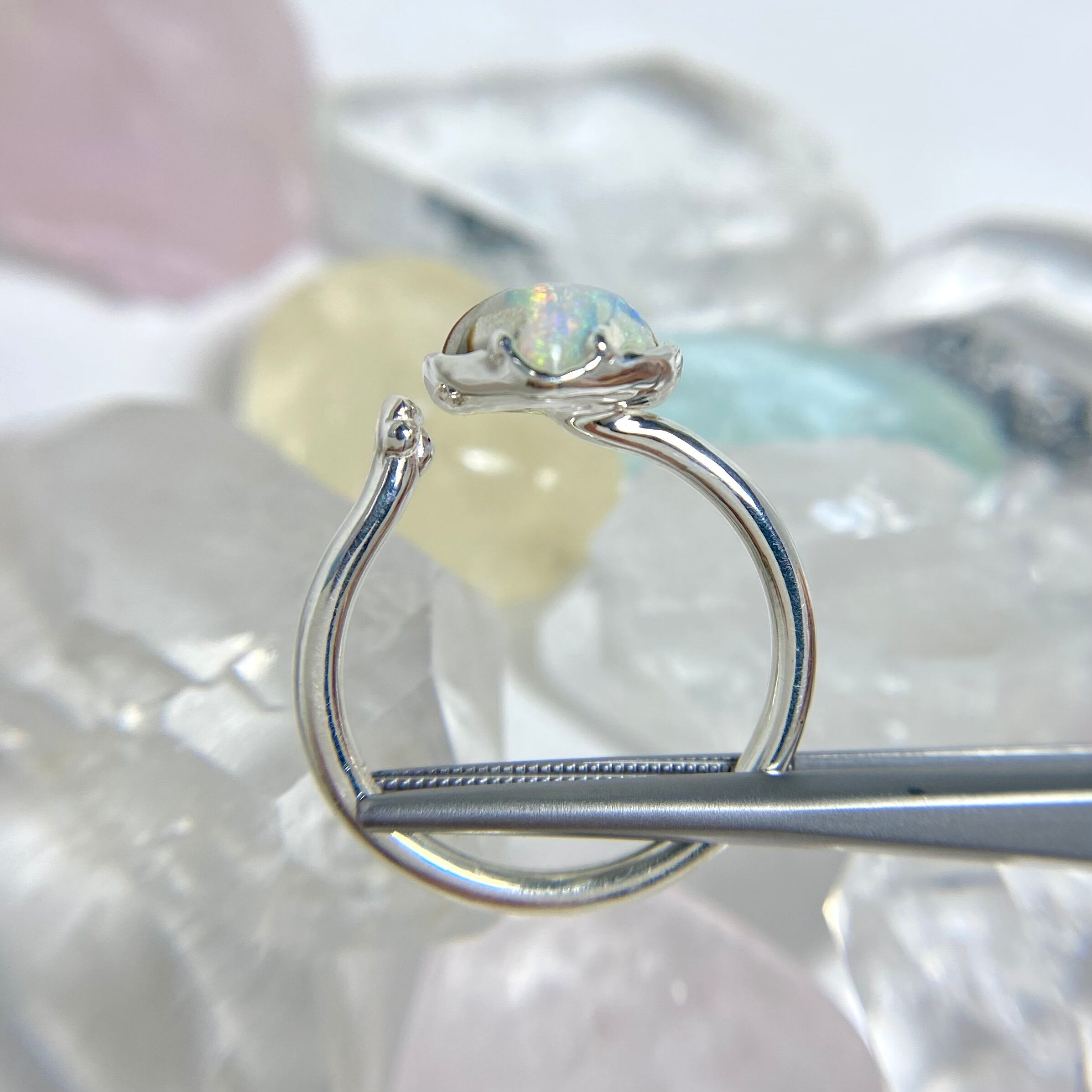 サイズについてもこだわりがあり、リングサイズは約13号のオープンリングとなっており、16号までの調整も可能です。ただし、サイズを大きくすると石枠とアームが離れますので、その点はご了承ください。