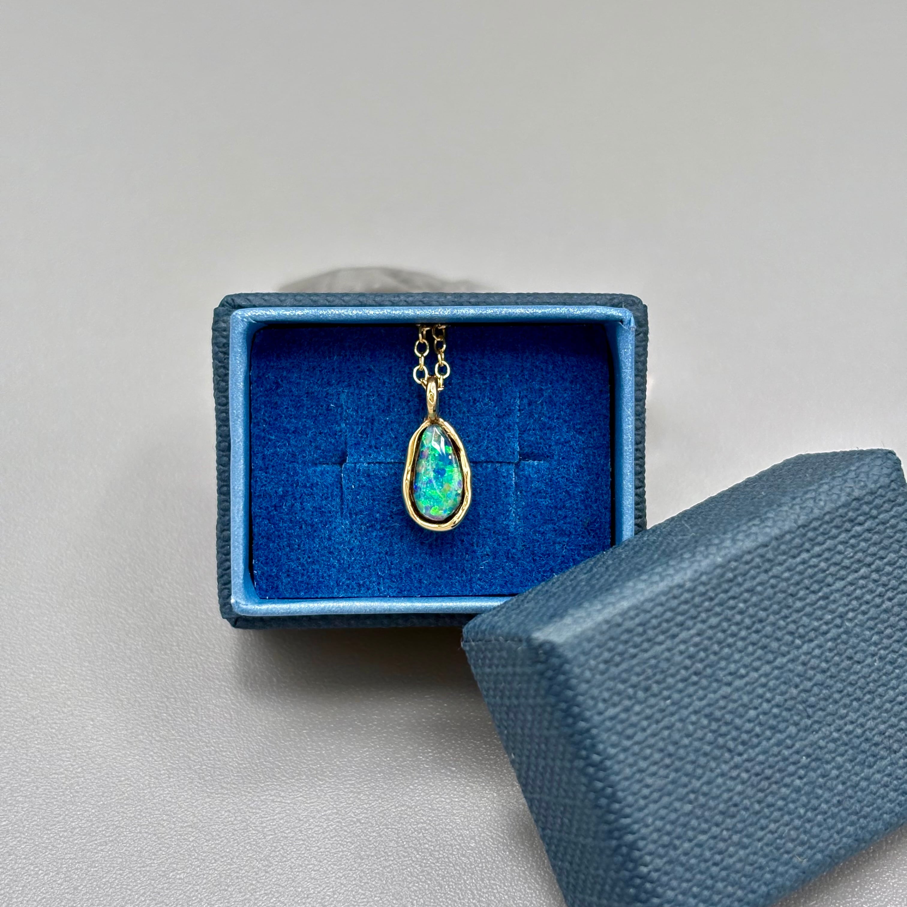 角度を変えるたびに、グリーンを主体にブルー、イエローの光がやわらかく揺らめき、自然が生み出した幻想的な表情を楽しめます。