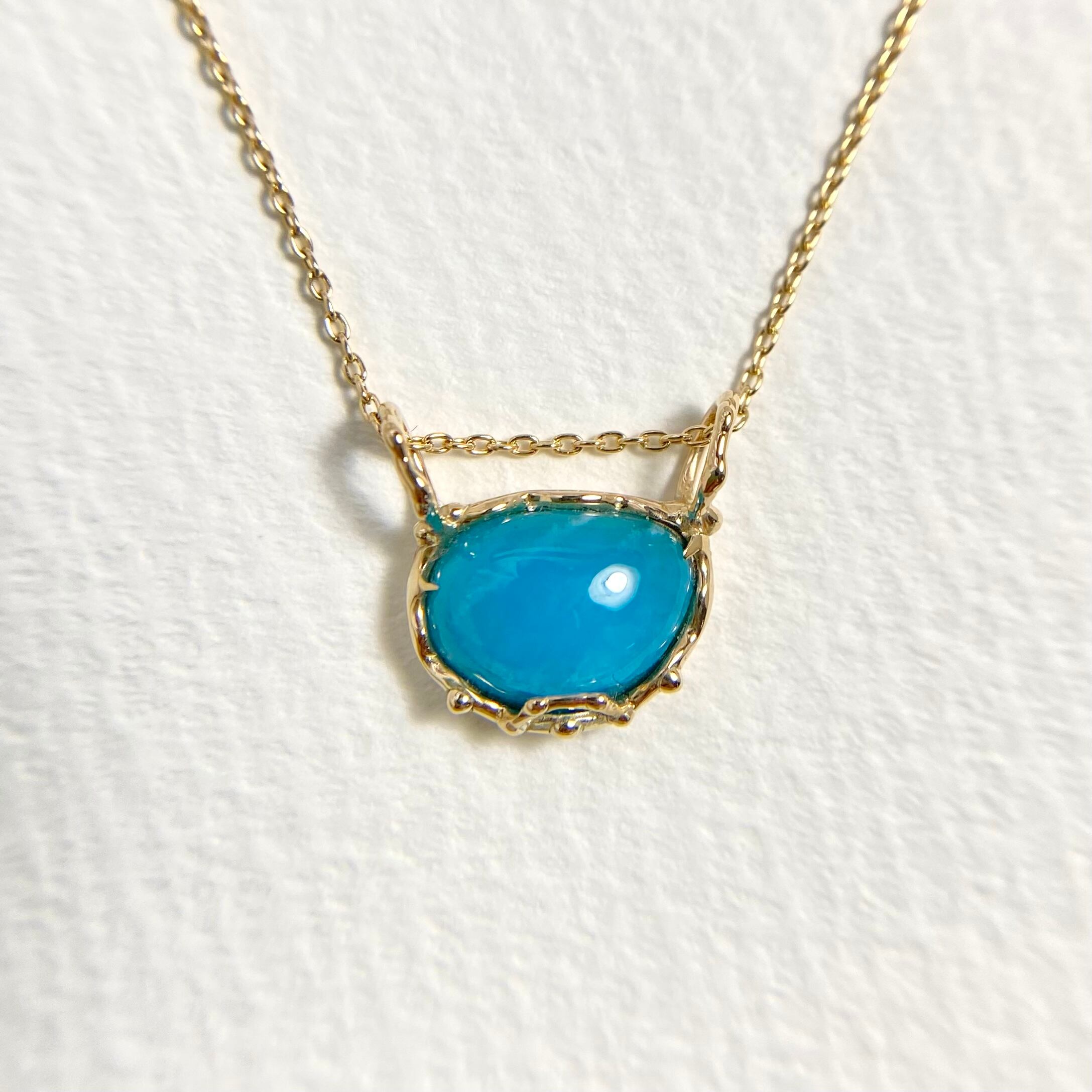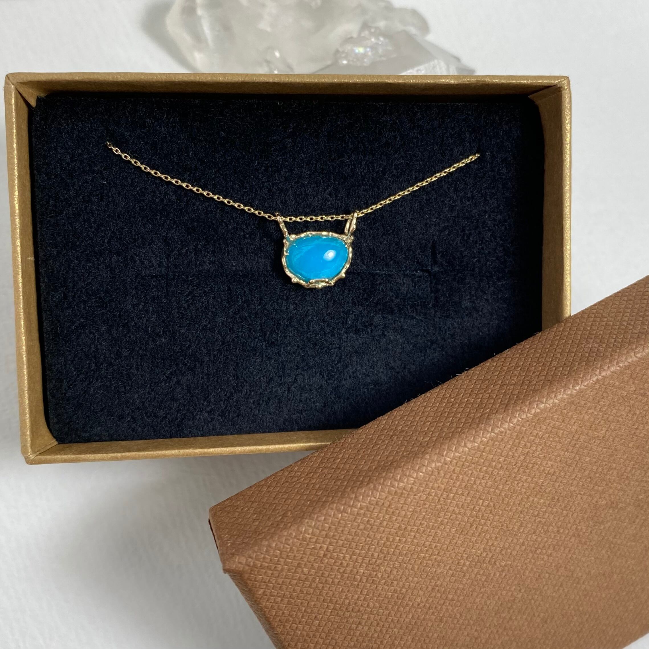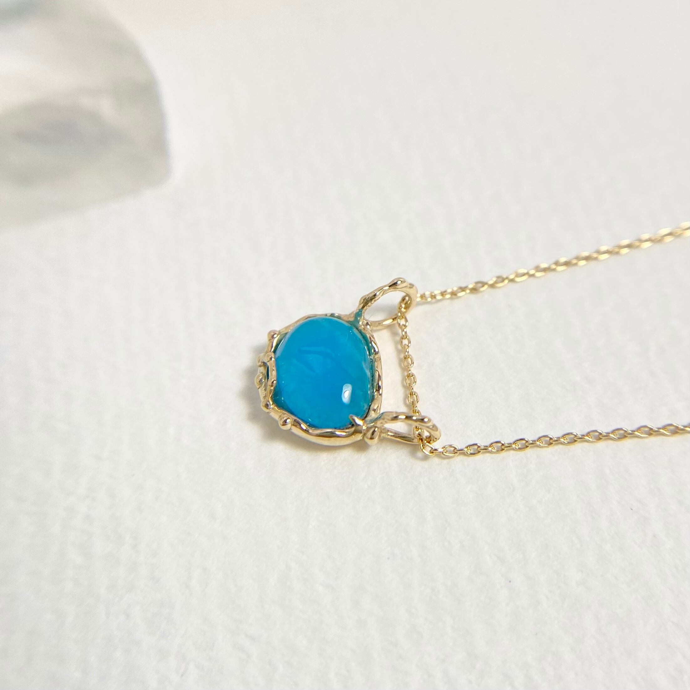 ヘミモルファイトの明るいブルーとK10の優しいゴールドカラーがとても合っていて大人可愛いネックレスです。ヘミモルファイトは硬度が低くて、研磨が難しいため、あまりジュエリーに加工されないので、珍しいお品です。
