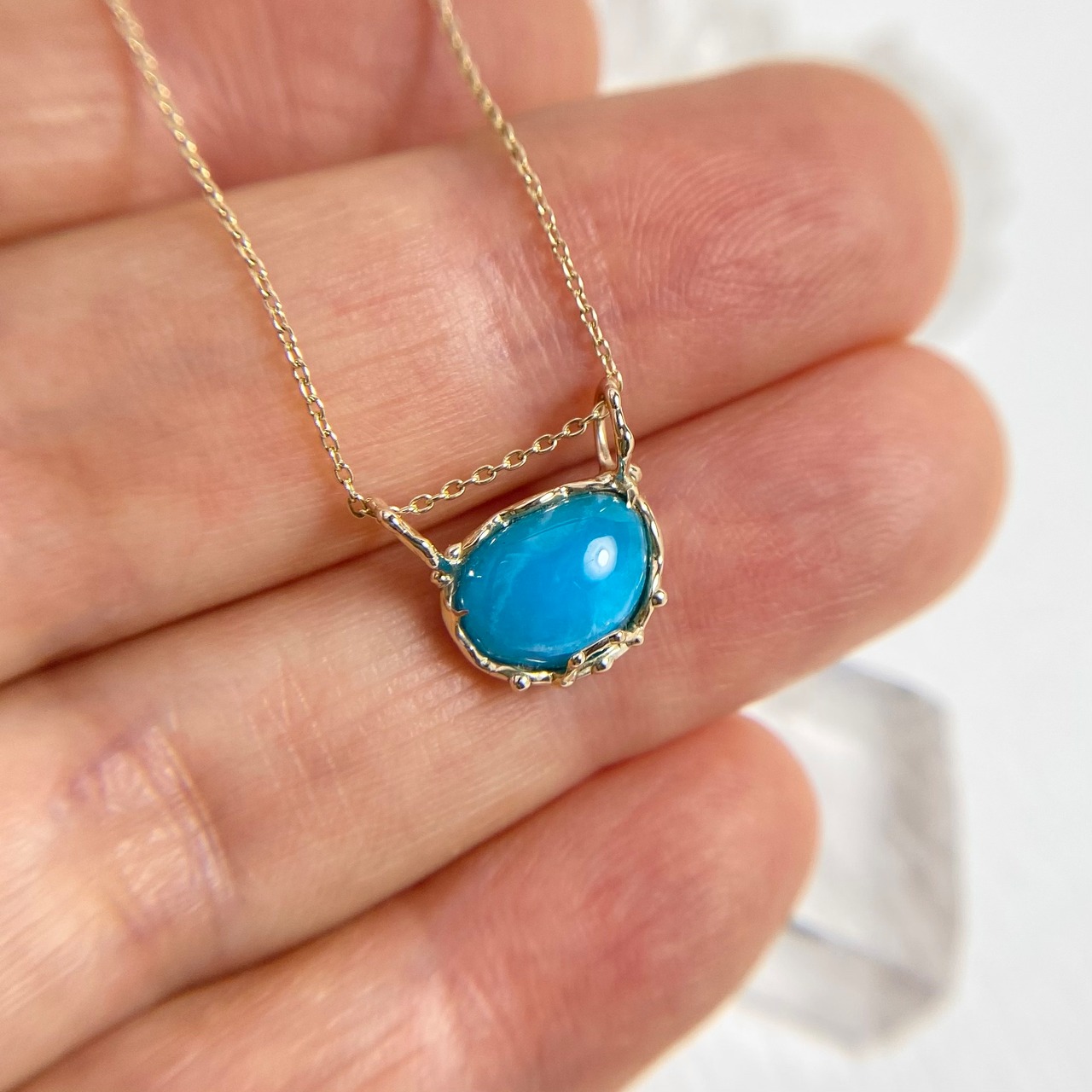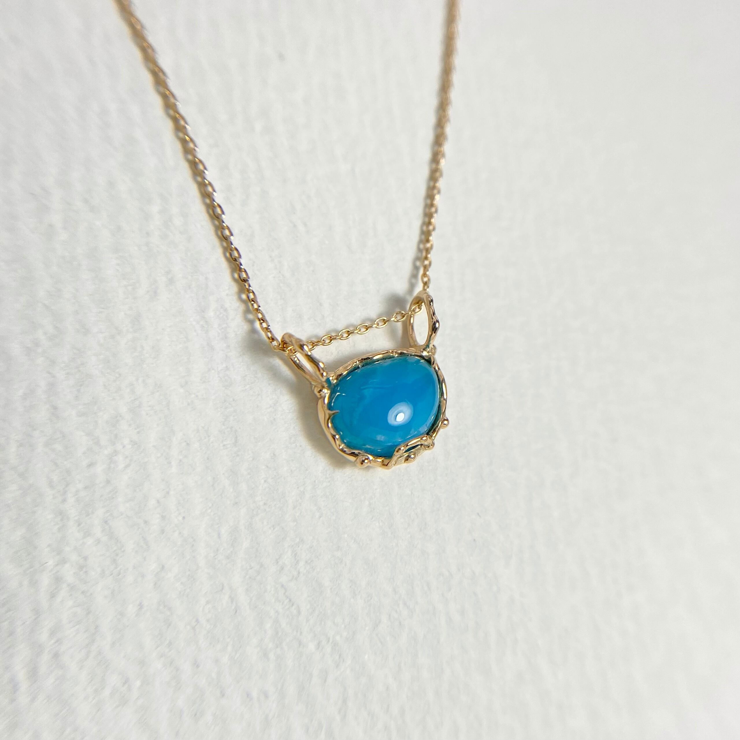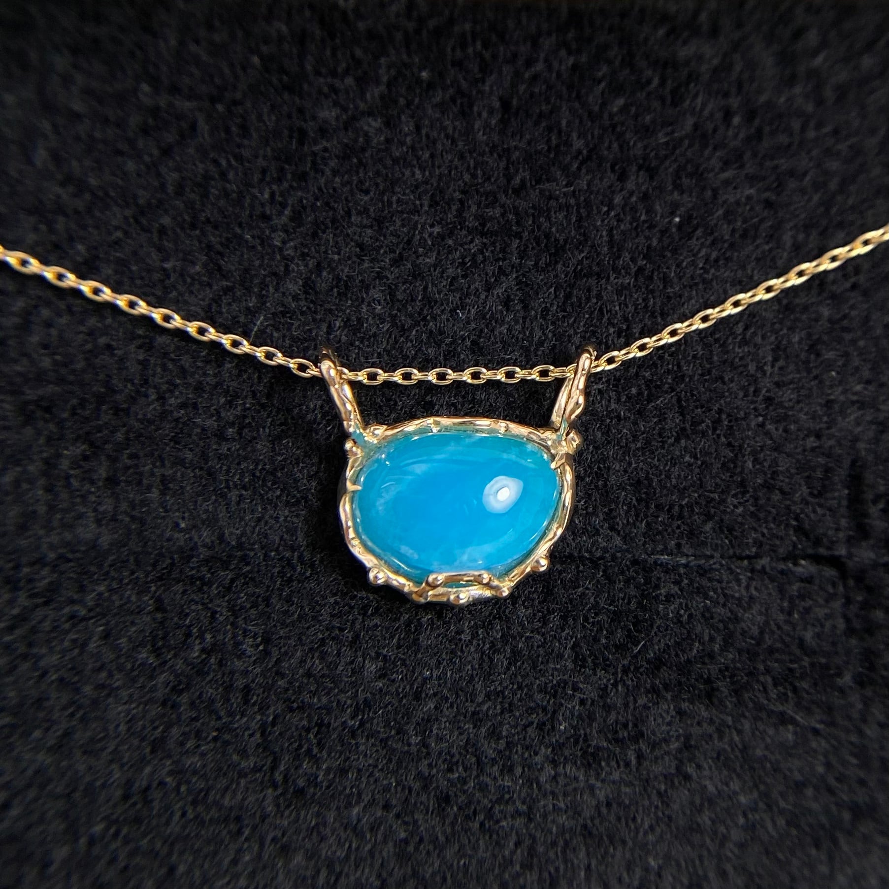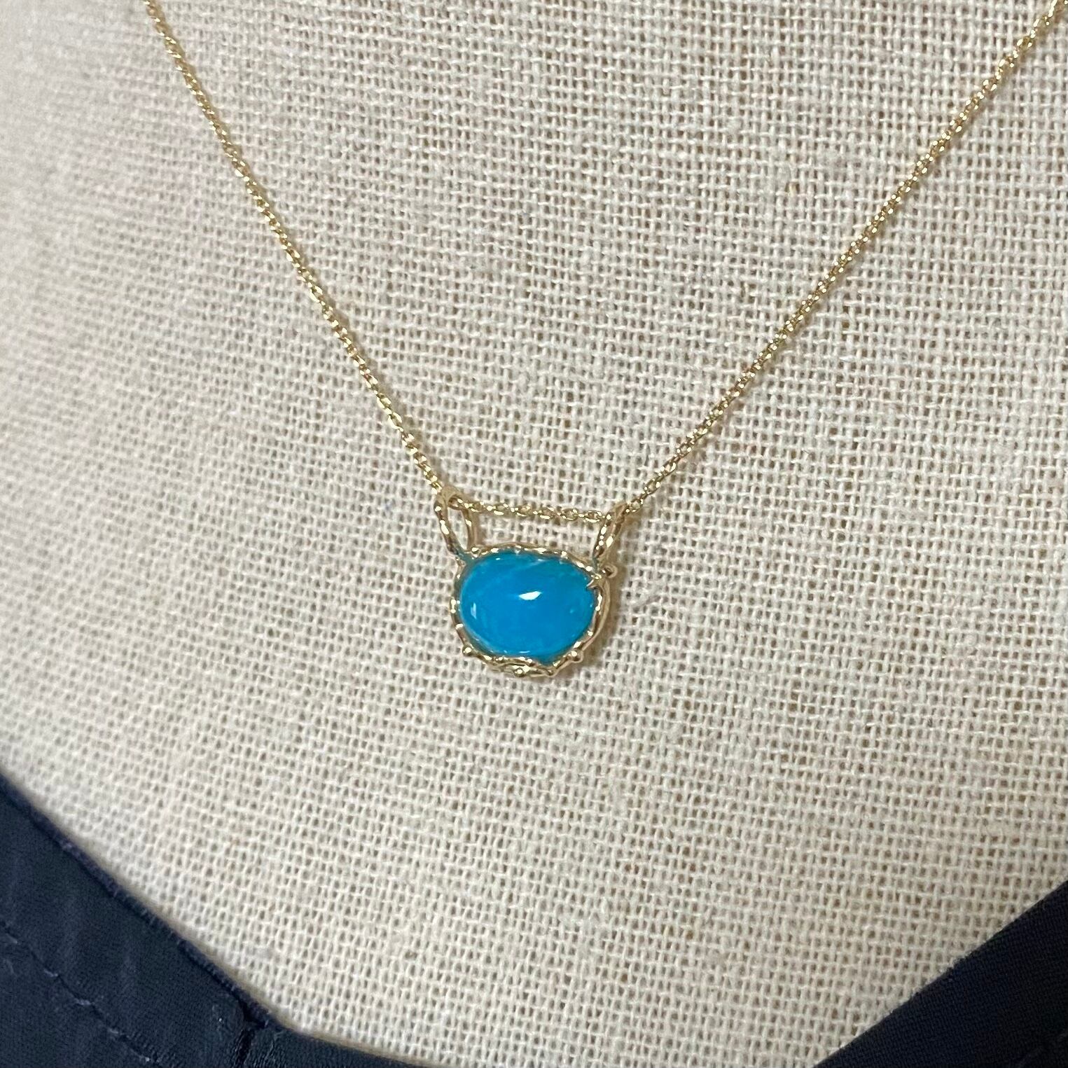 ヘミモルファイトの明るいブルーとK10の優しいゴールドカラーがとても合っていて大人可愛いネックレスです。ヘミモルファイトは硬度が低くて、研磨が難しいため、あまりジュエリーに加工されないので、珍しいお品です。