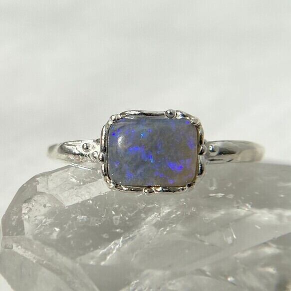 オーストラリア、ライトニングリッジ産のオパール原石を磨き上げた、魅力的なスクウェアシルバーリングです。