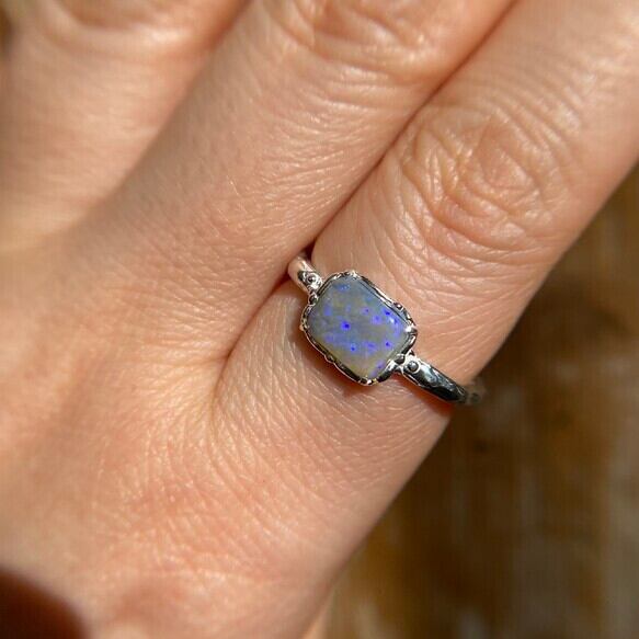 天然オパールは見る角度によって遊色が変わり、楽しい石です。太陽光の下でリングを動かして遊色の変化をお楽しみ下さい。