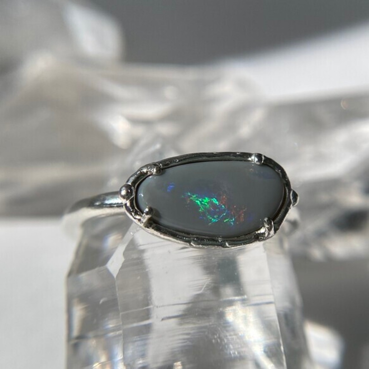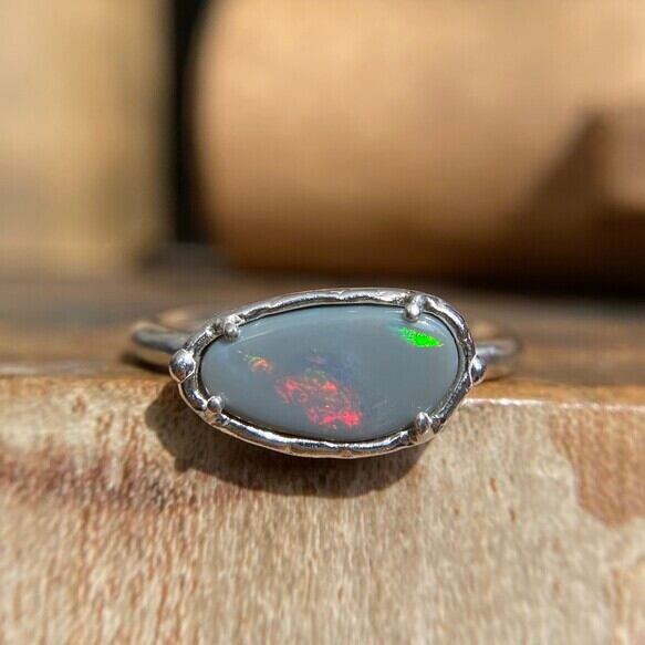 天然オパールは見る角度によって遊色が変わり、楽しい石です。太陽光の下でリングを動かして遊色の変化をお楽しみ下さい。