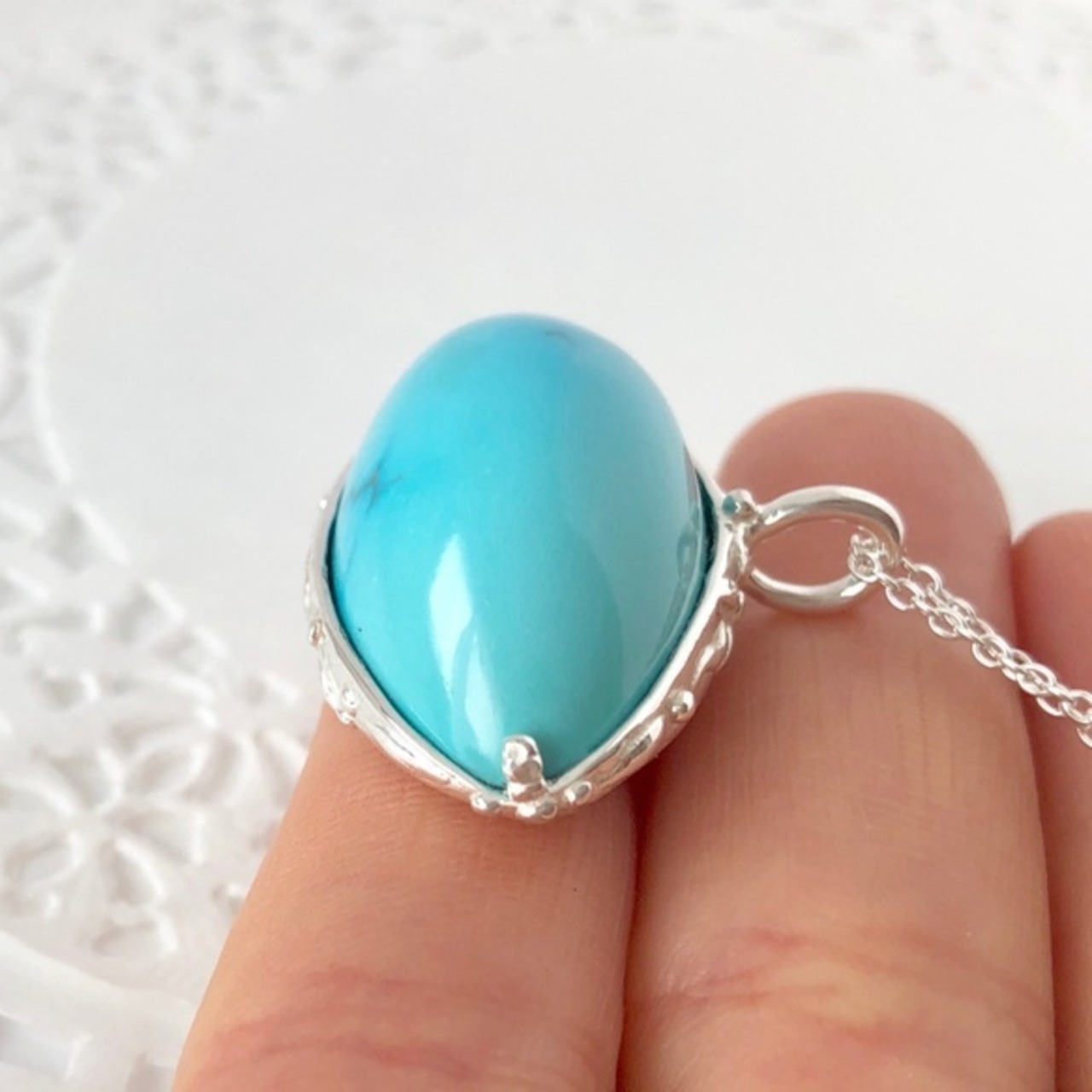 アリゾナ州スリーピングビューティー産の天然トルコ石原石を研磨して可愛い純銀のネックレスを作りました。