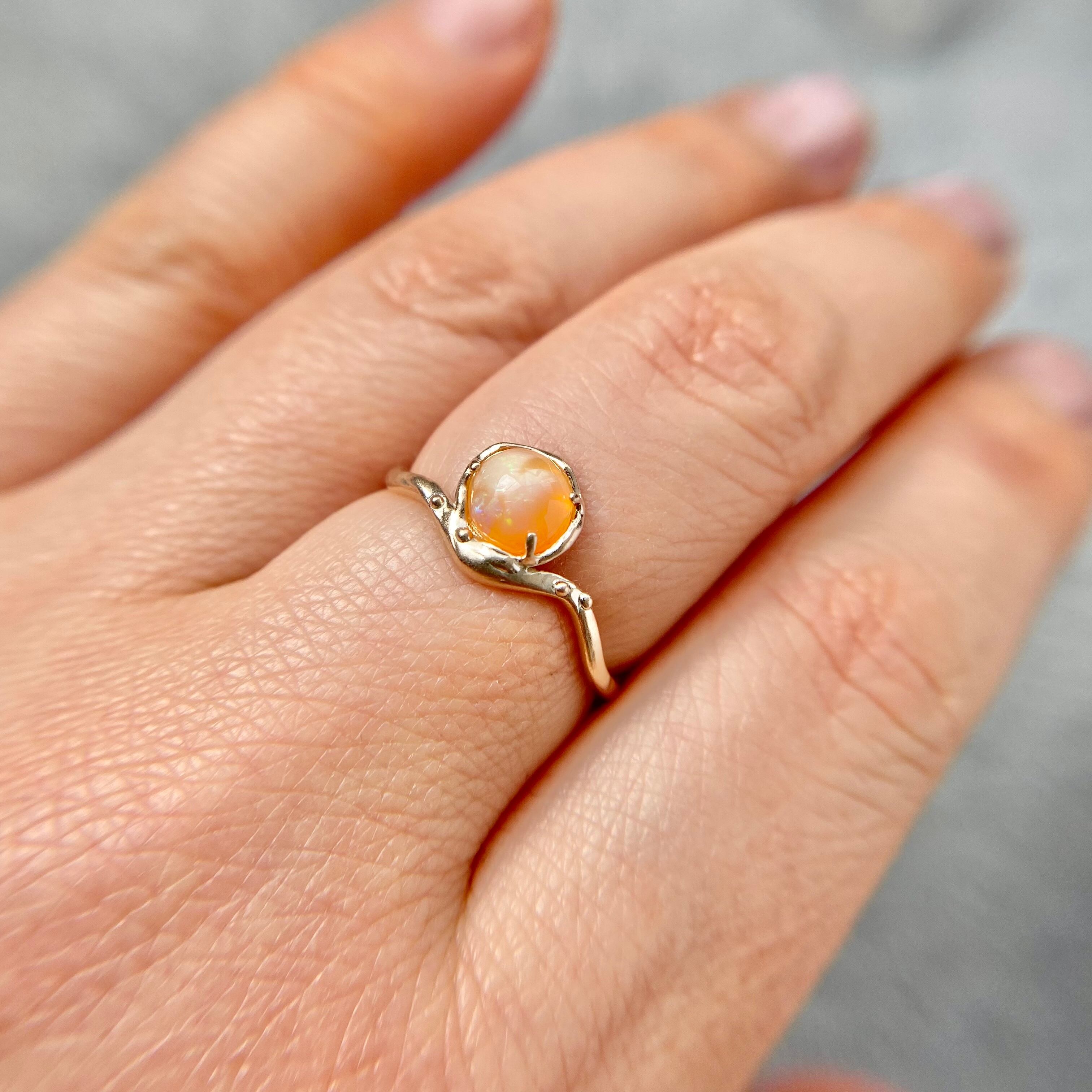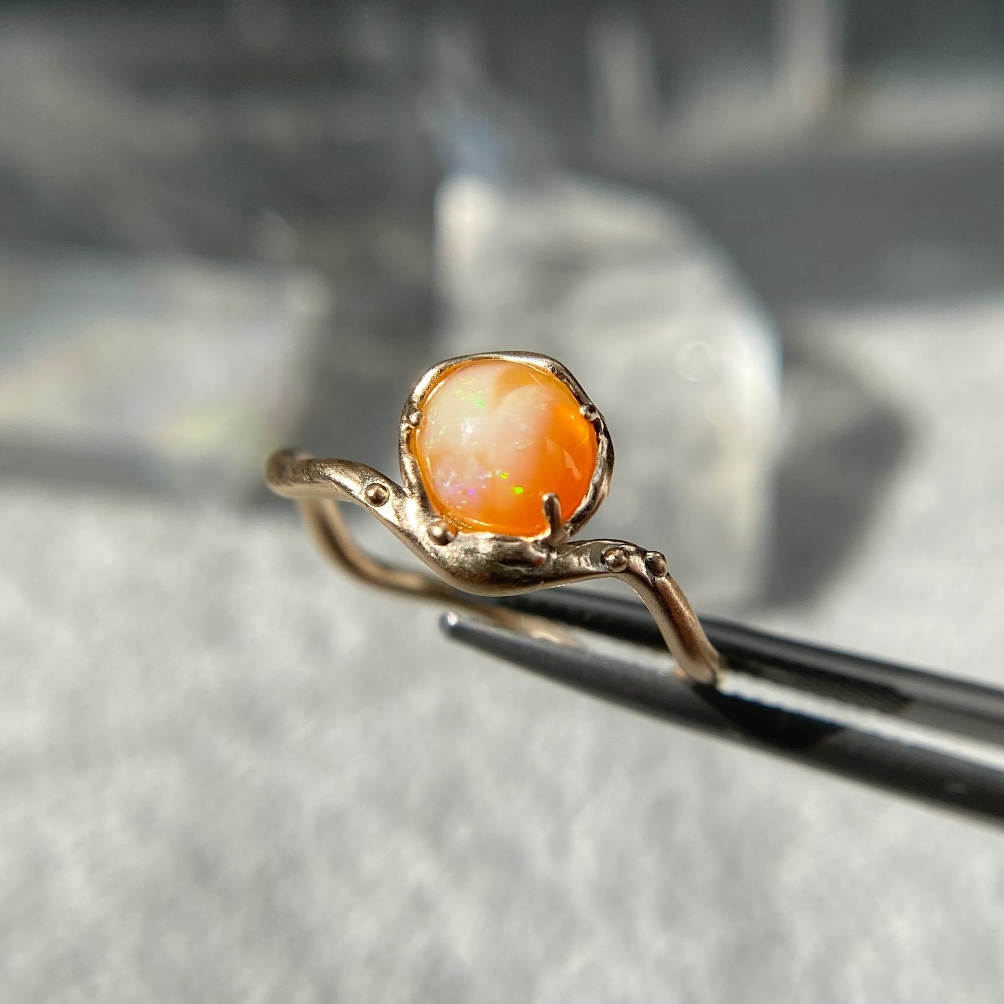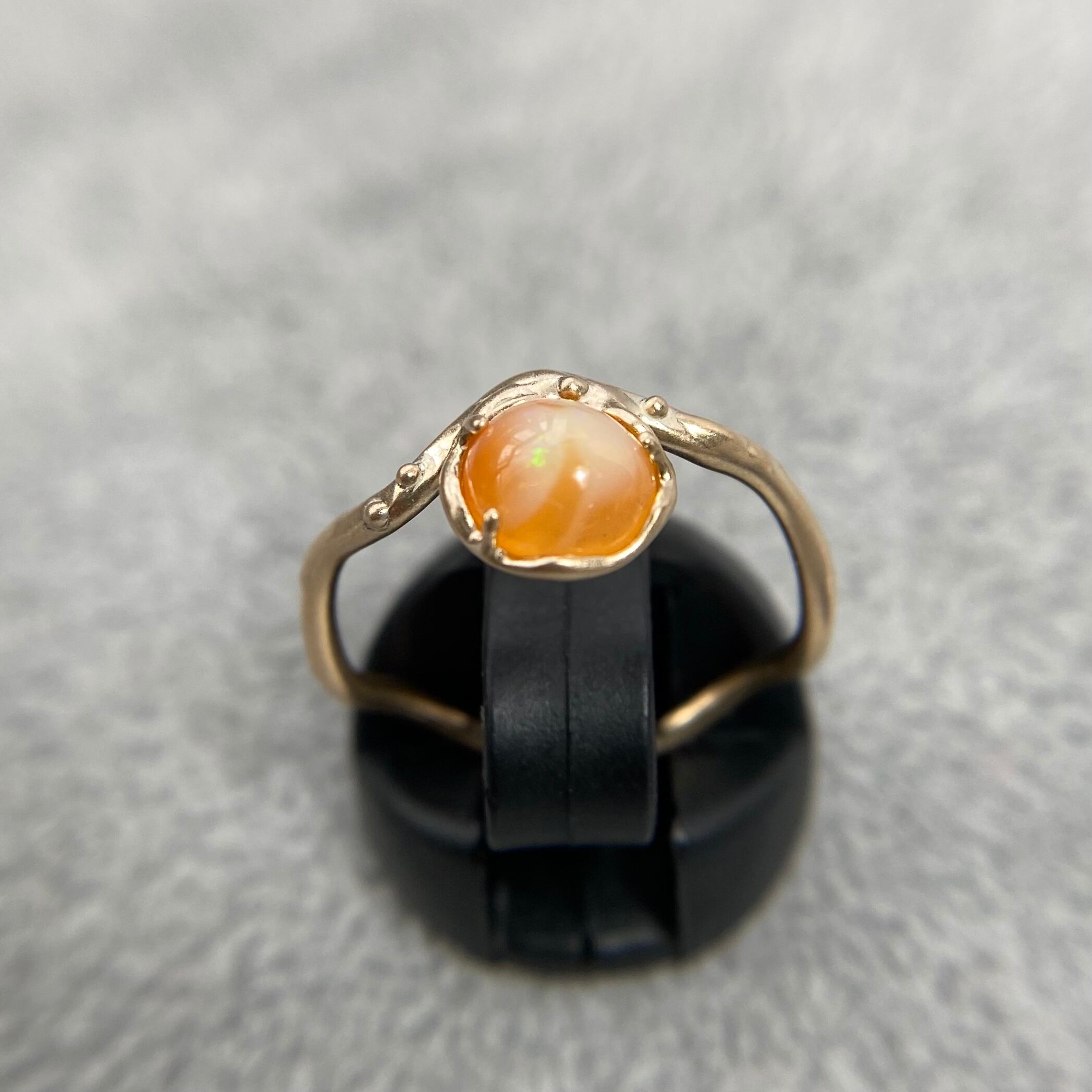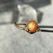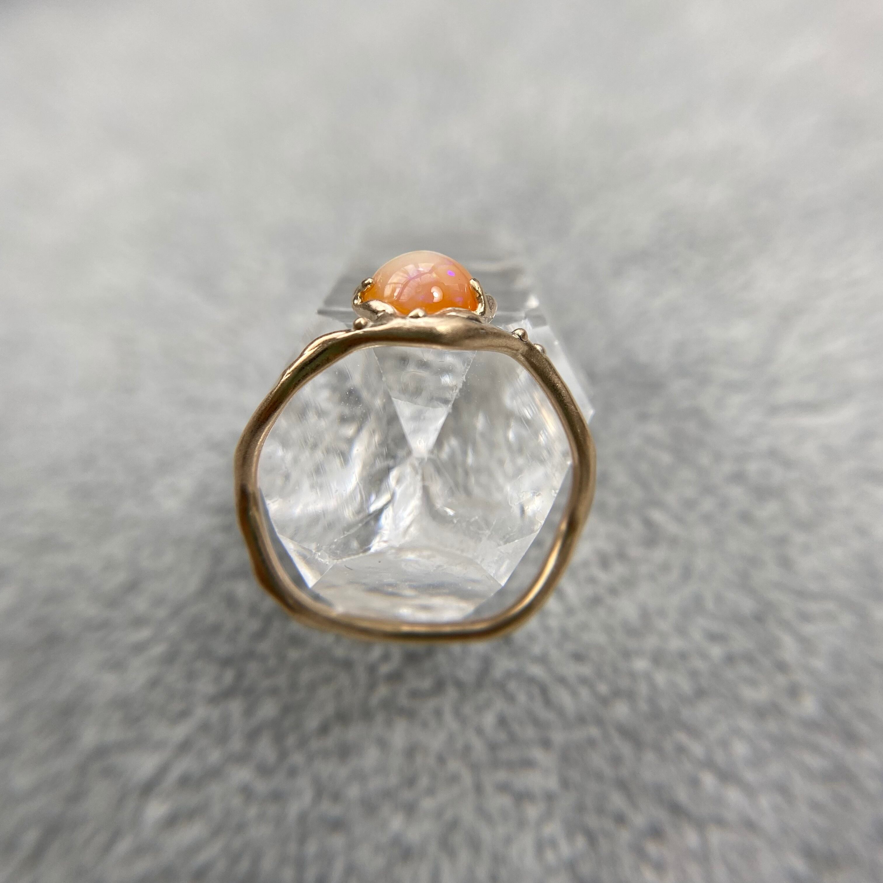 このリングは透明感のあるオレンジカラーに、ミルキーホワイトカラーの模様がオーロラのように広がり、緑、青、黄色、紫色の遊色がキラキラと煌めく素敵なオパールを使用しています。