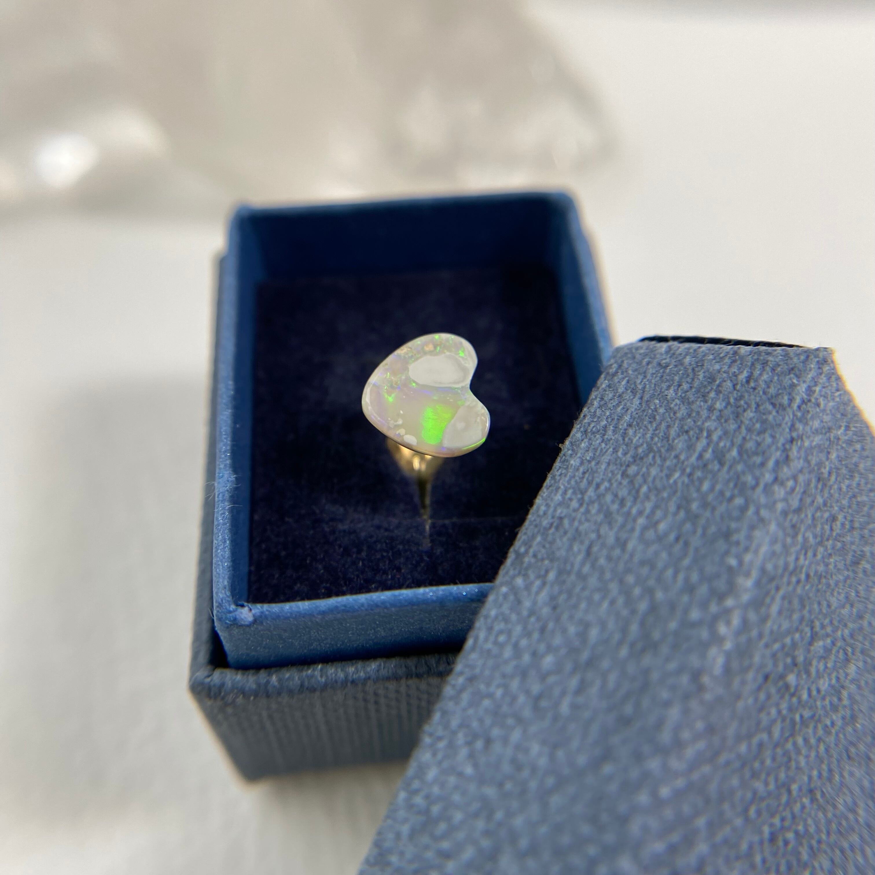 こちらのオパールは可愛いハートでグレーのグラデーションの模様が面白く、緑、黄色の遊色が見えてきれいです。