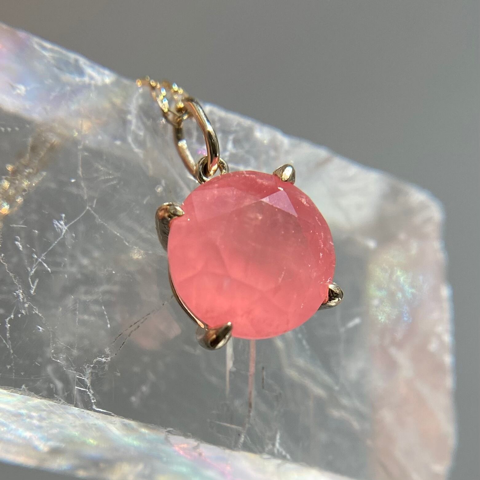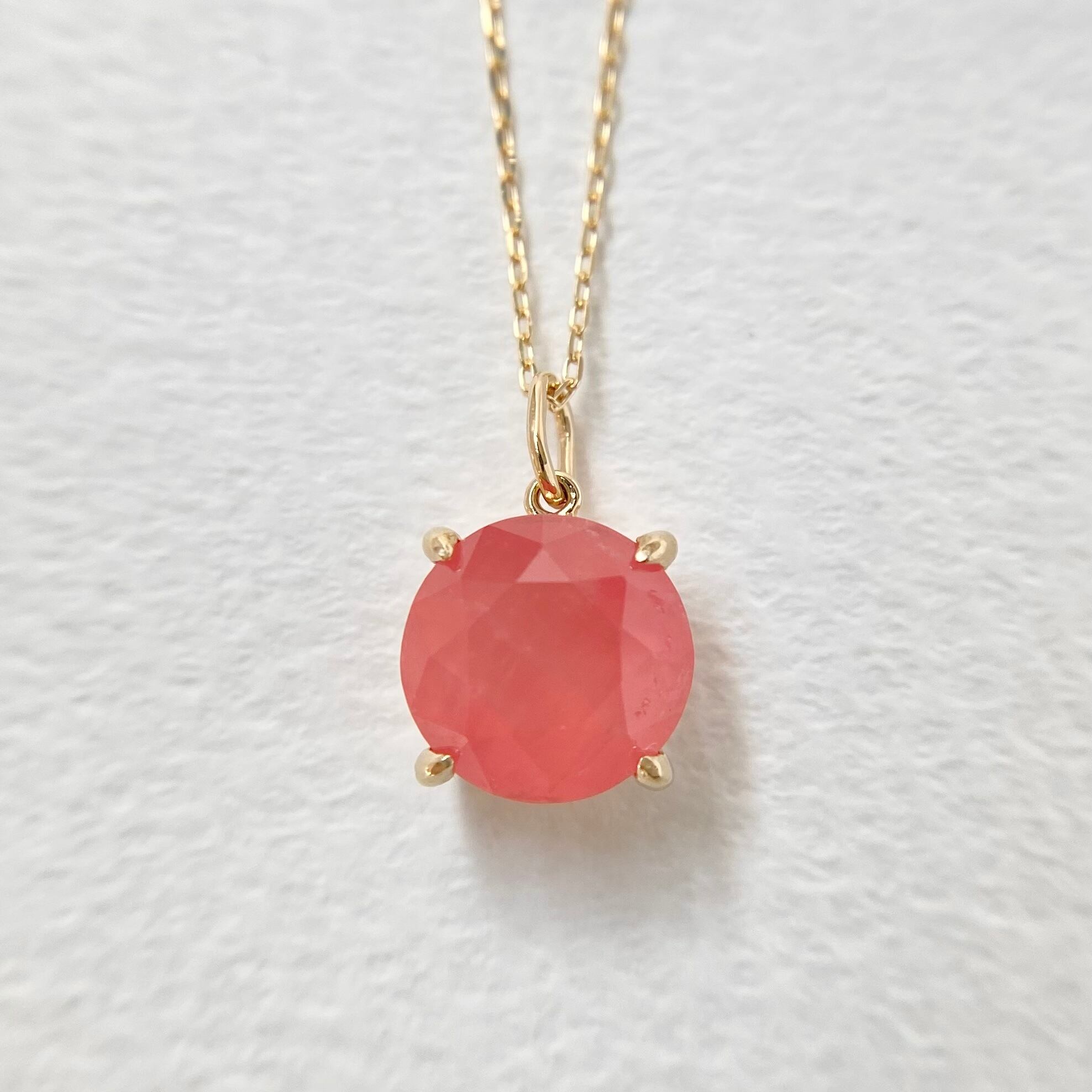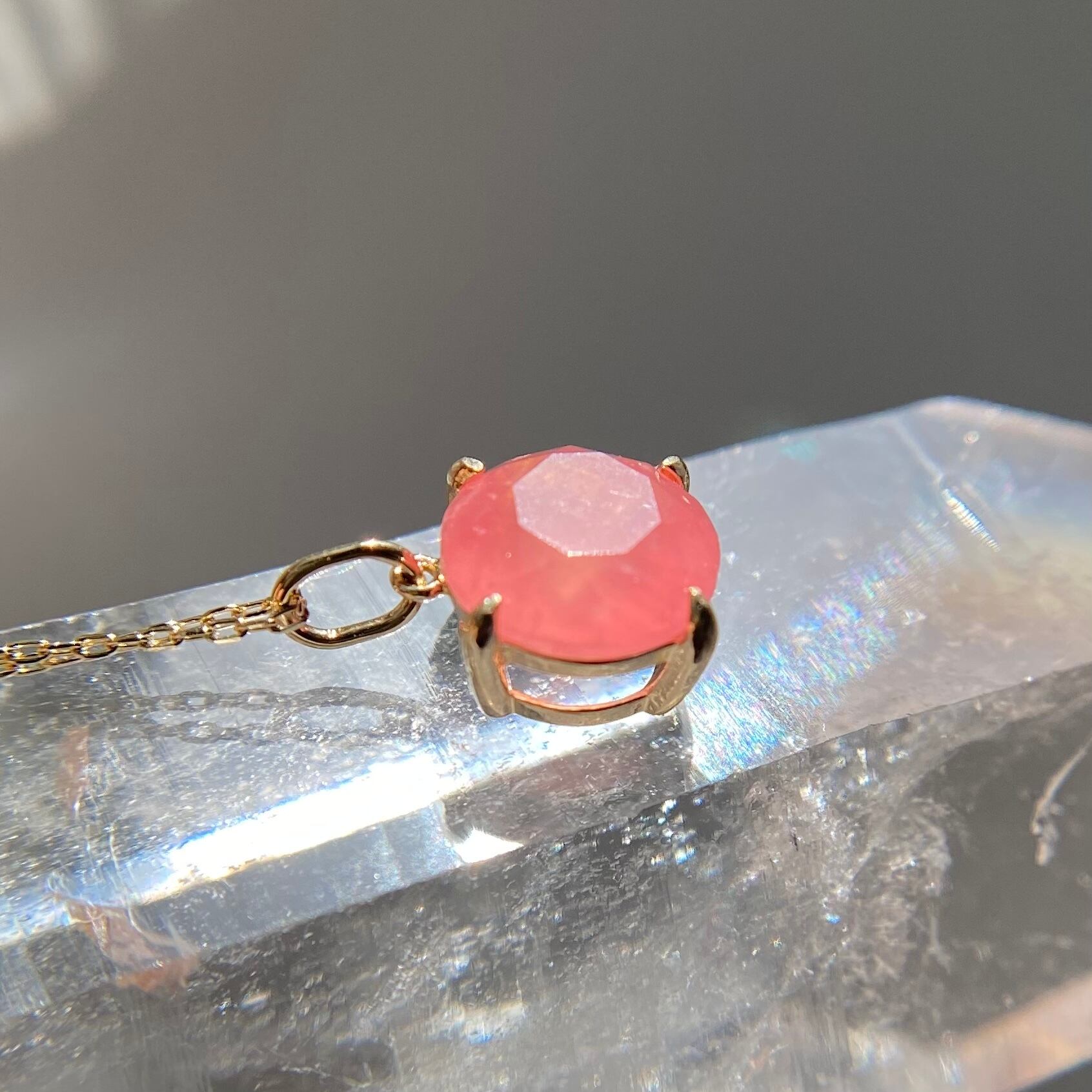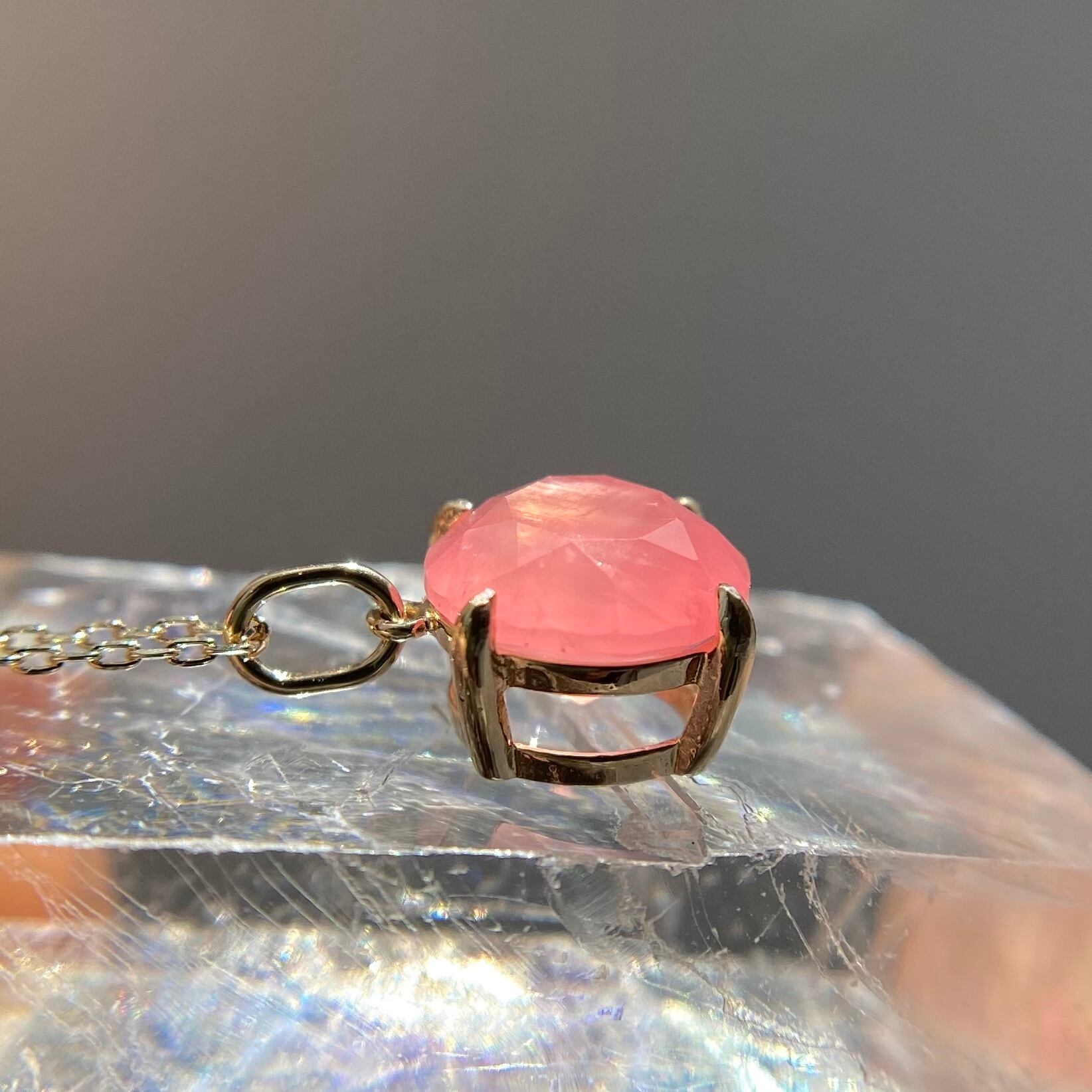 北海道産の天然ロードクロサイト原石をファセットカットに研磨して、シンプルなネックレスを作りました。