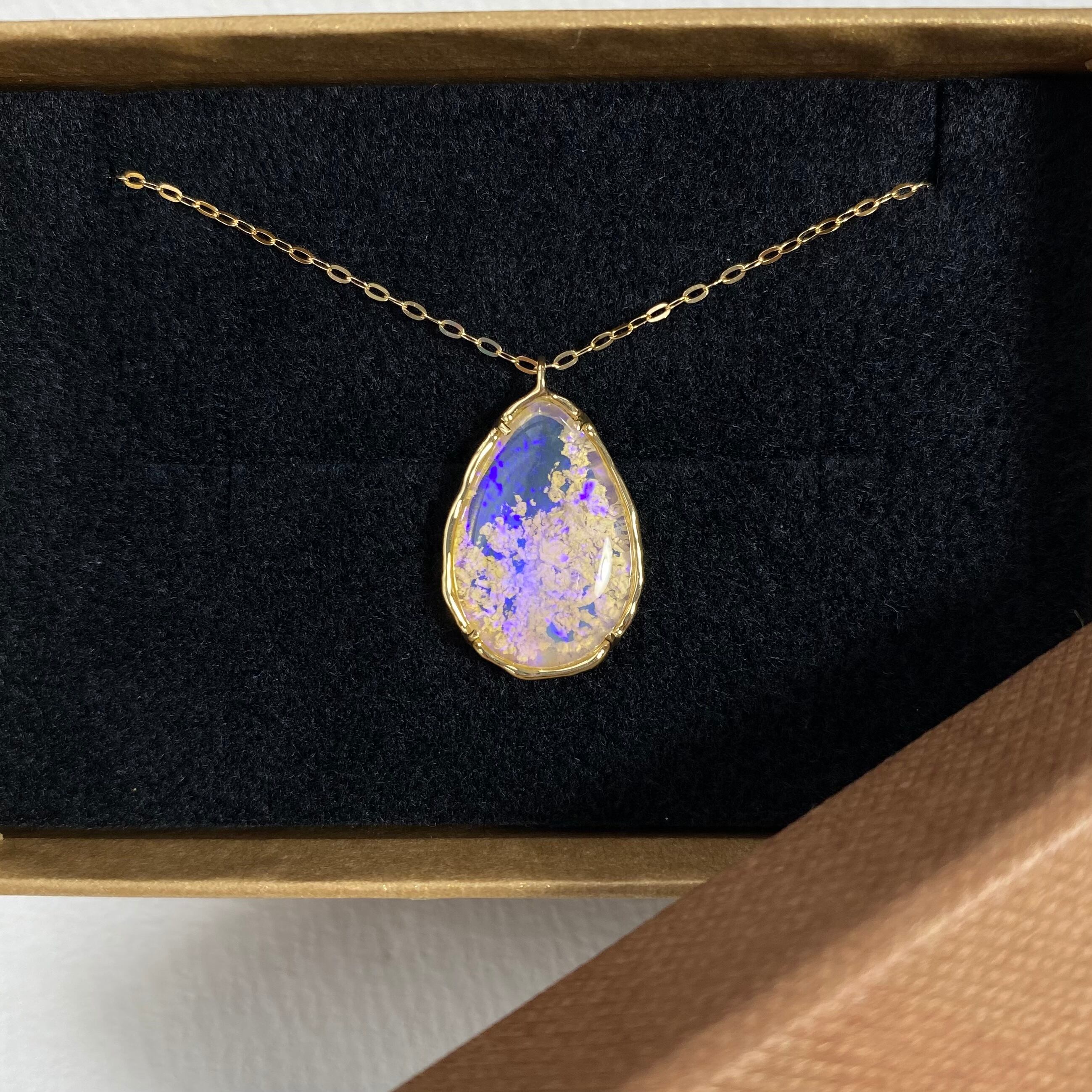 母岩のベージュの模様が水中花のように美しく、石枠はとろけるような可愛いデザイン、優しく繊細な印象を与えるオパールネックレスに仕上がりました。