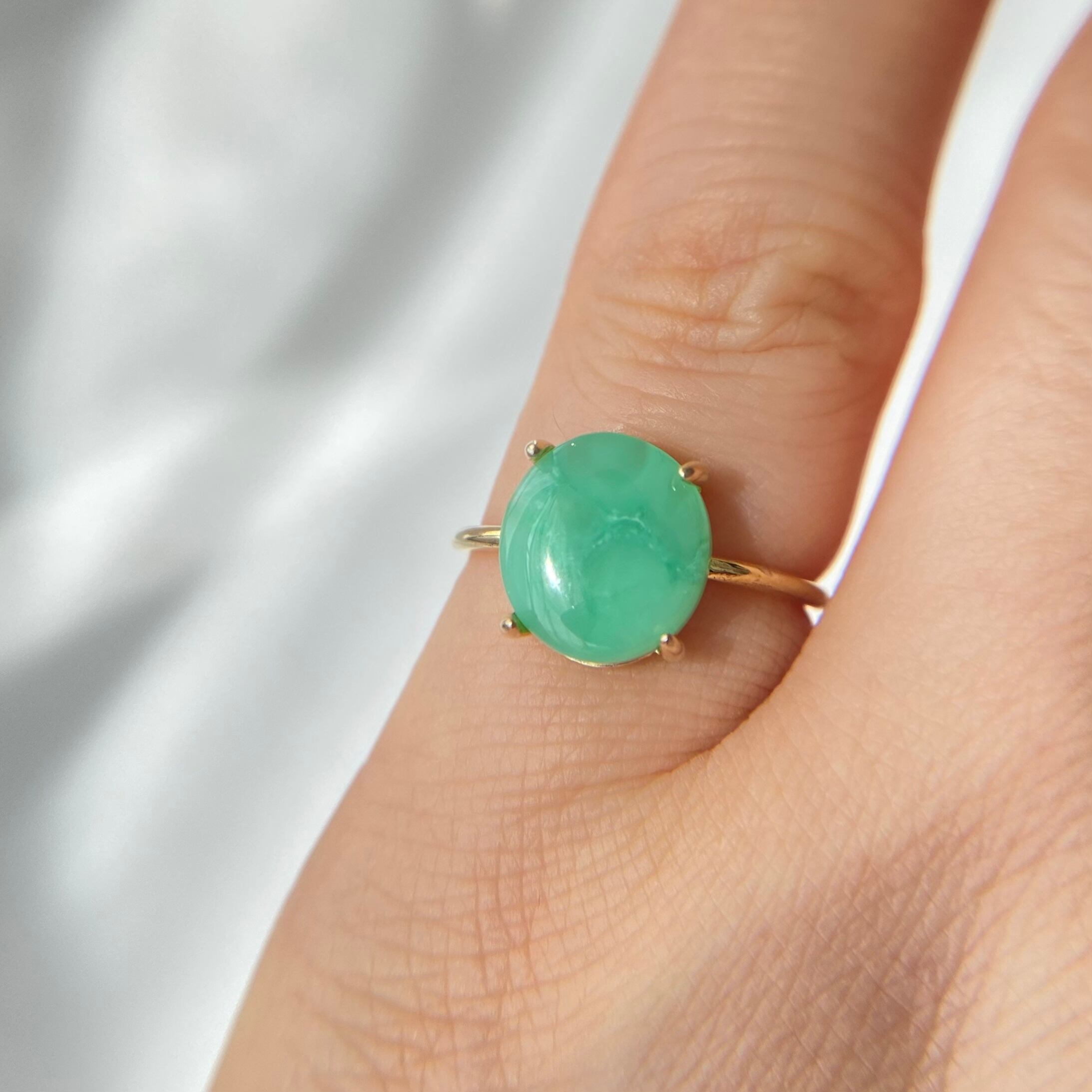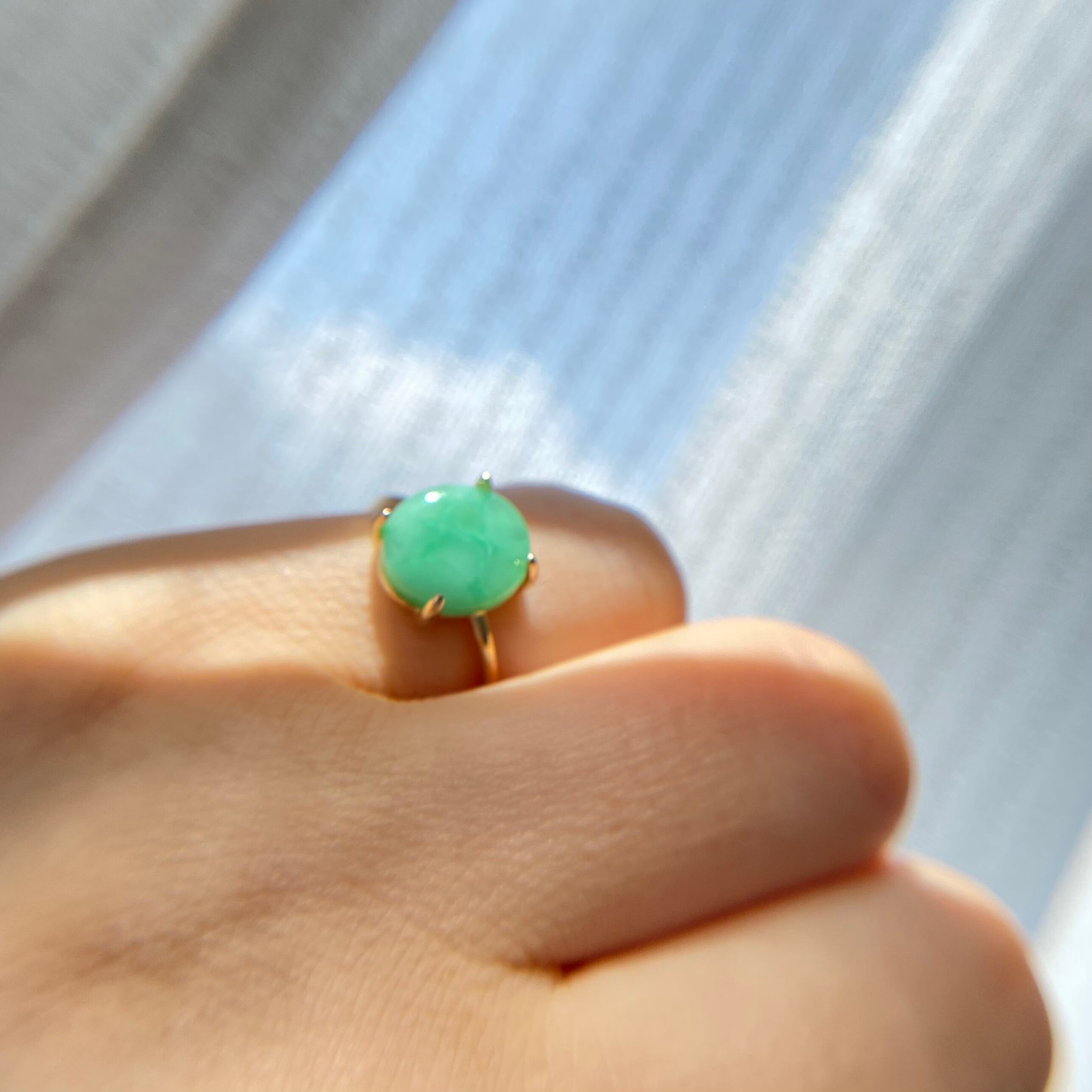 オーストラリア産の天然クリソプレーズ原石をカボションカットに研磨して、シンプルなリングを作りました。