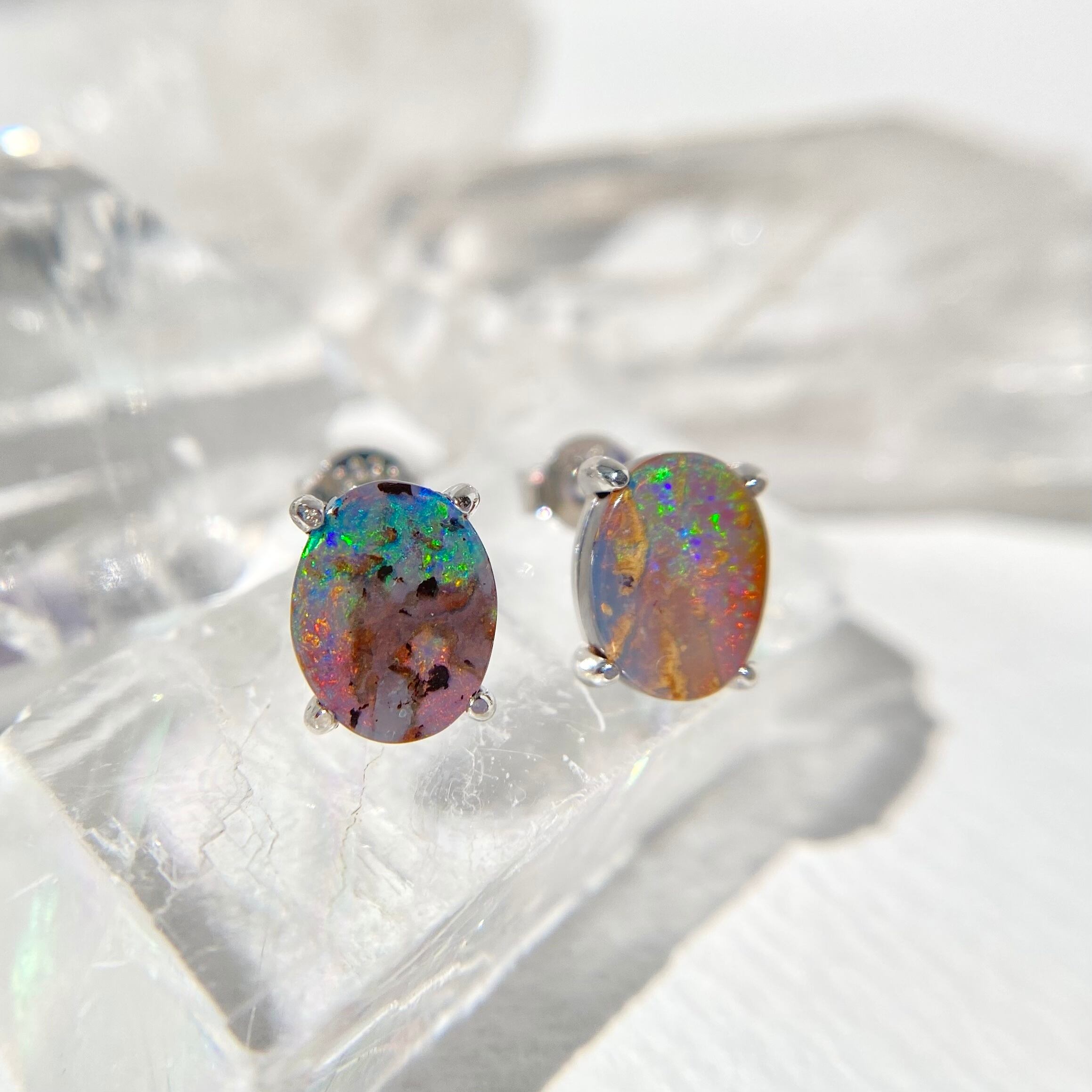 オーストラリア、yowah産の天然ボルダーオパール原石を研磨してシンプルな両耳シルバーピアスを作りました。
