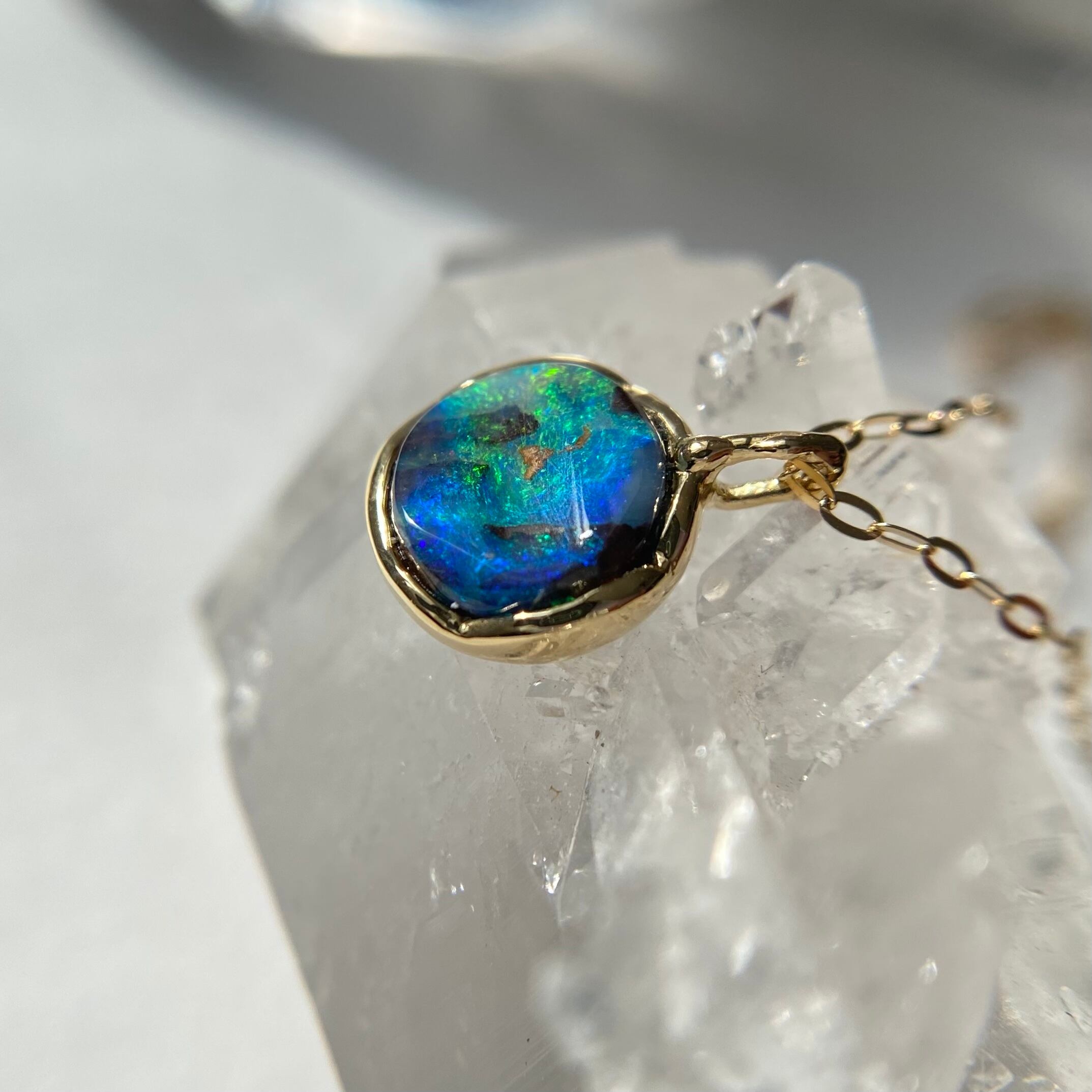 オーストラリア、Yowah産のボルダーオパール原石を研磨して、石枠は可愛い花びらのように作り、繊細で可憐な雰囲気のオパールネックレスに仕上がりました。
