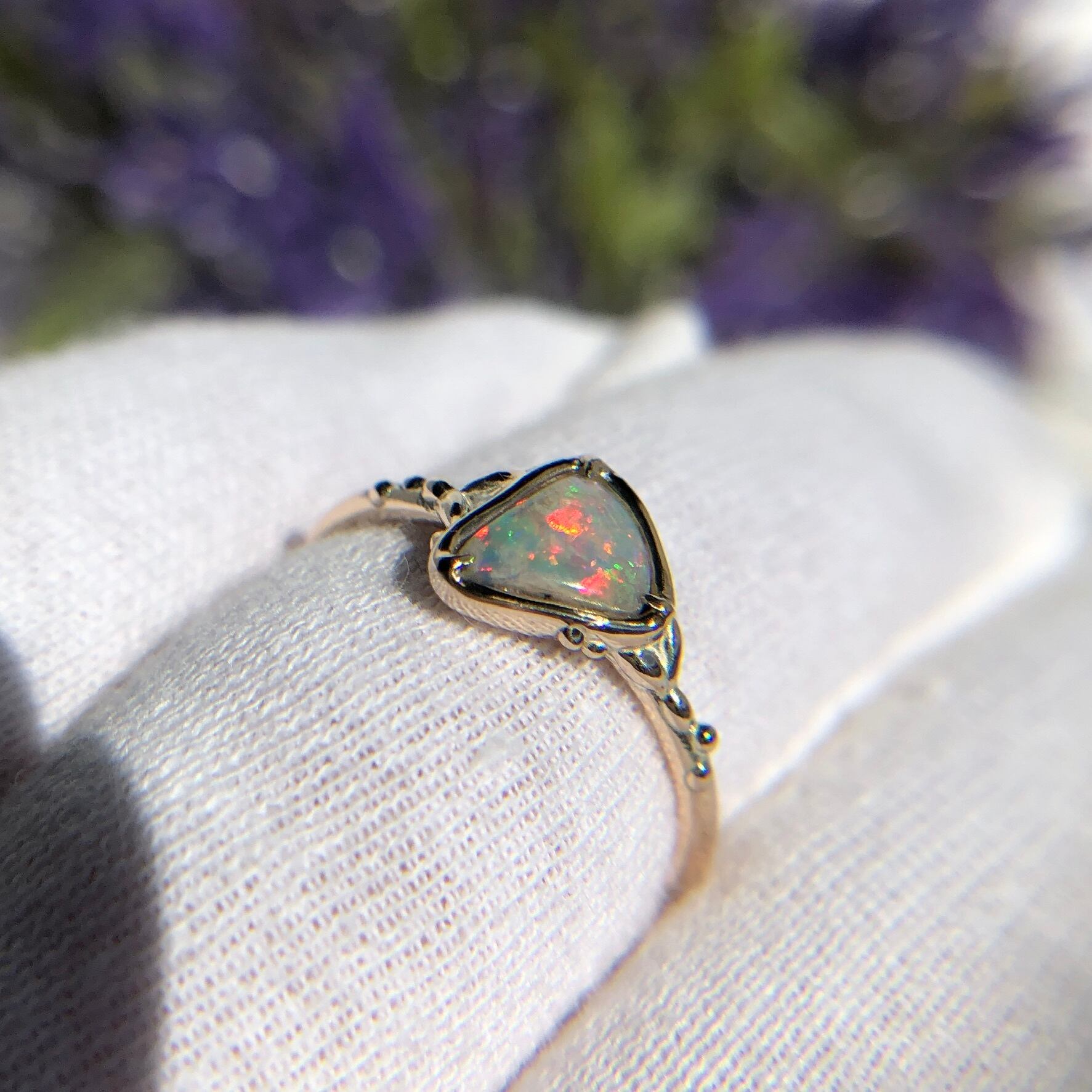 オーストラリア、NSW州ライトニングリッジ産の天然オパール原石を可愛い三角形に研磨してK10リングを作りました。