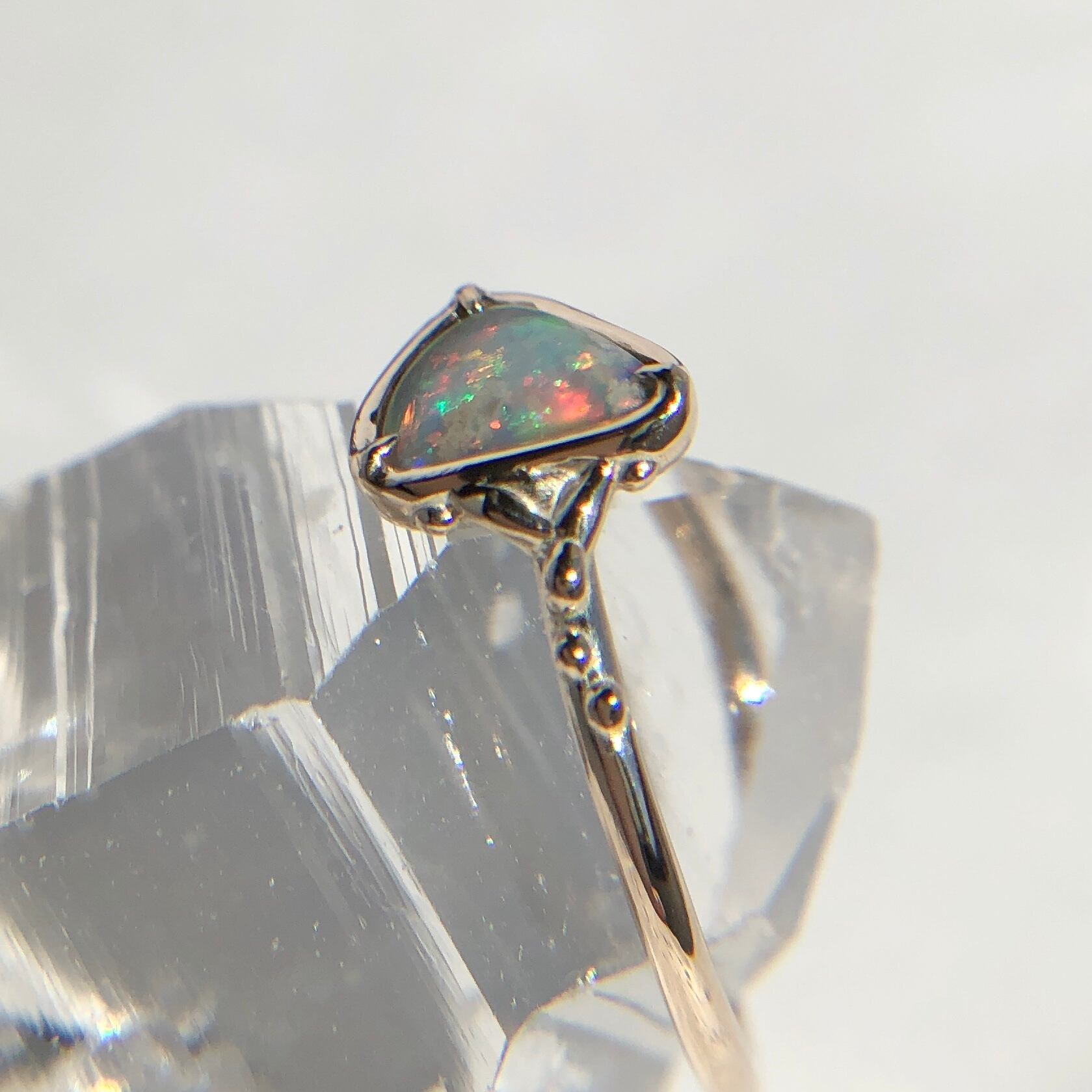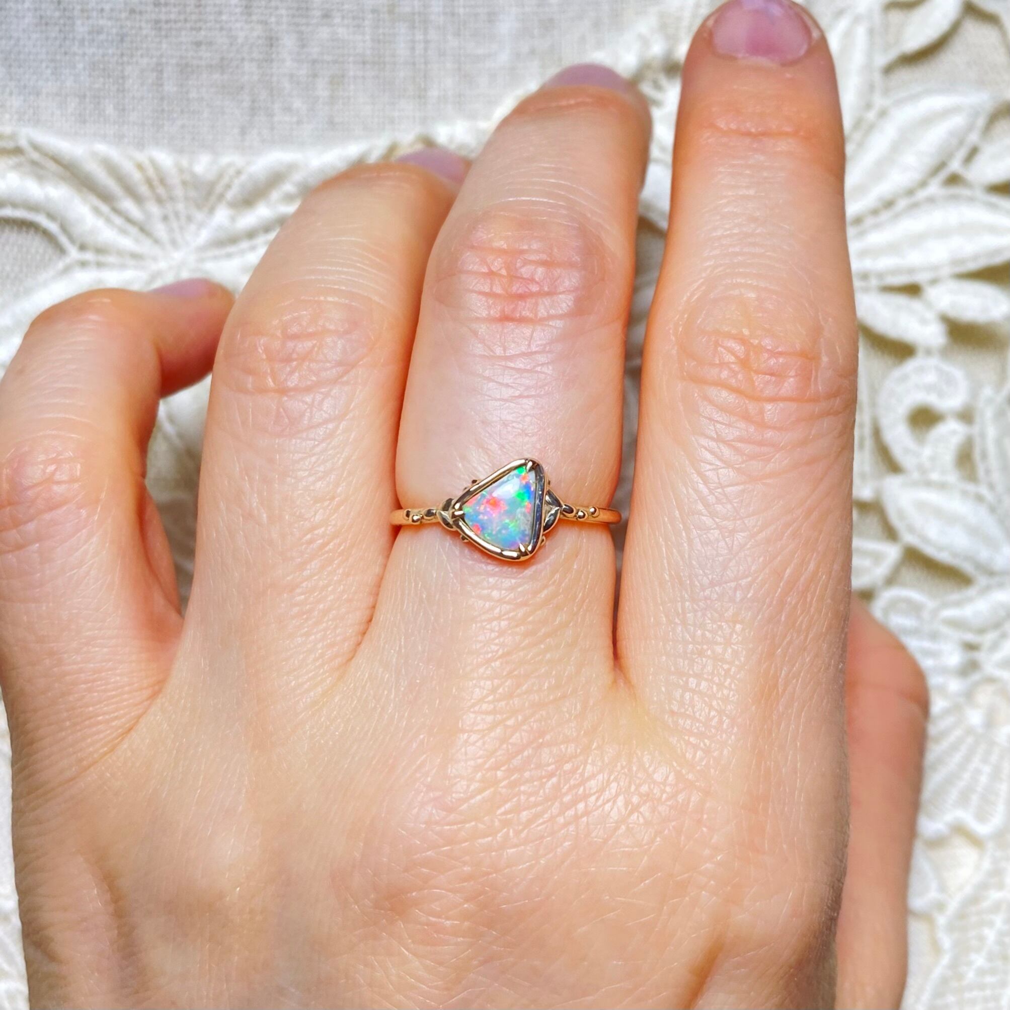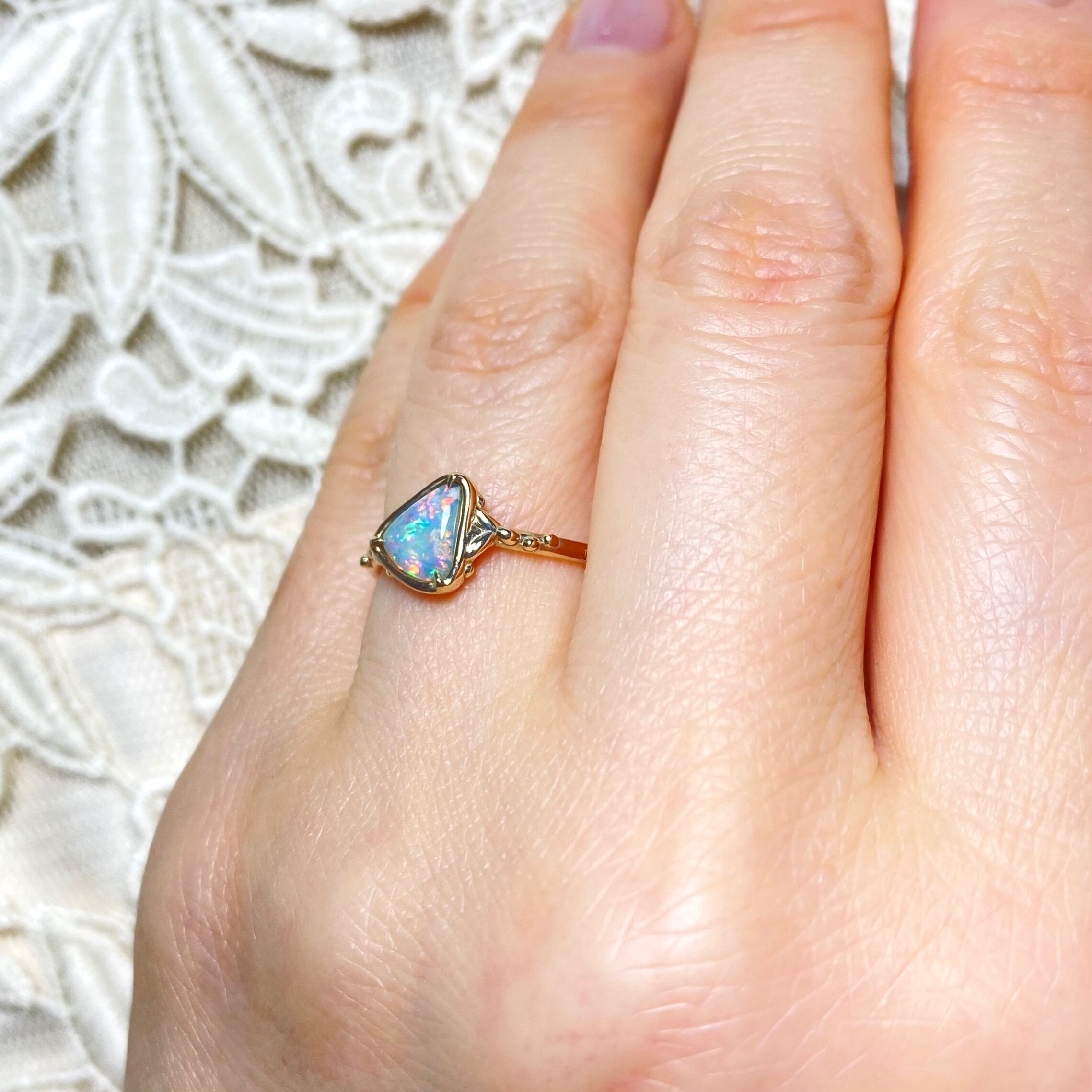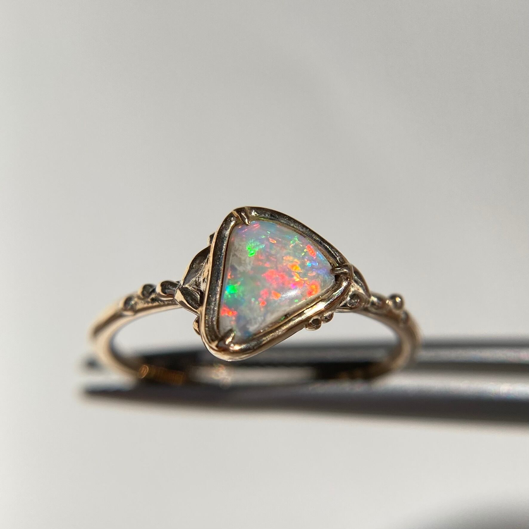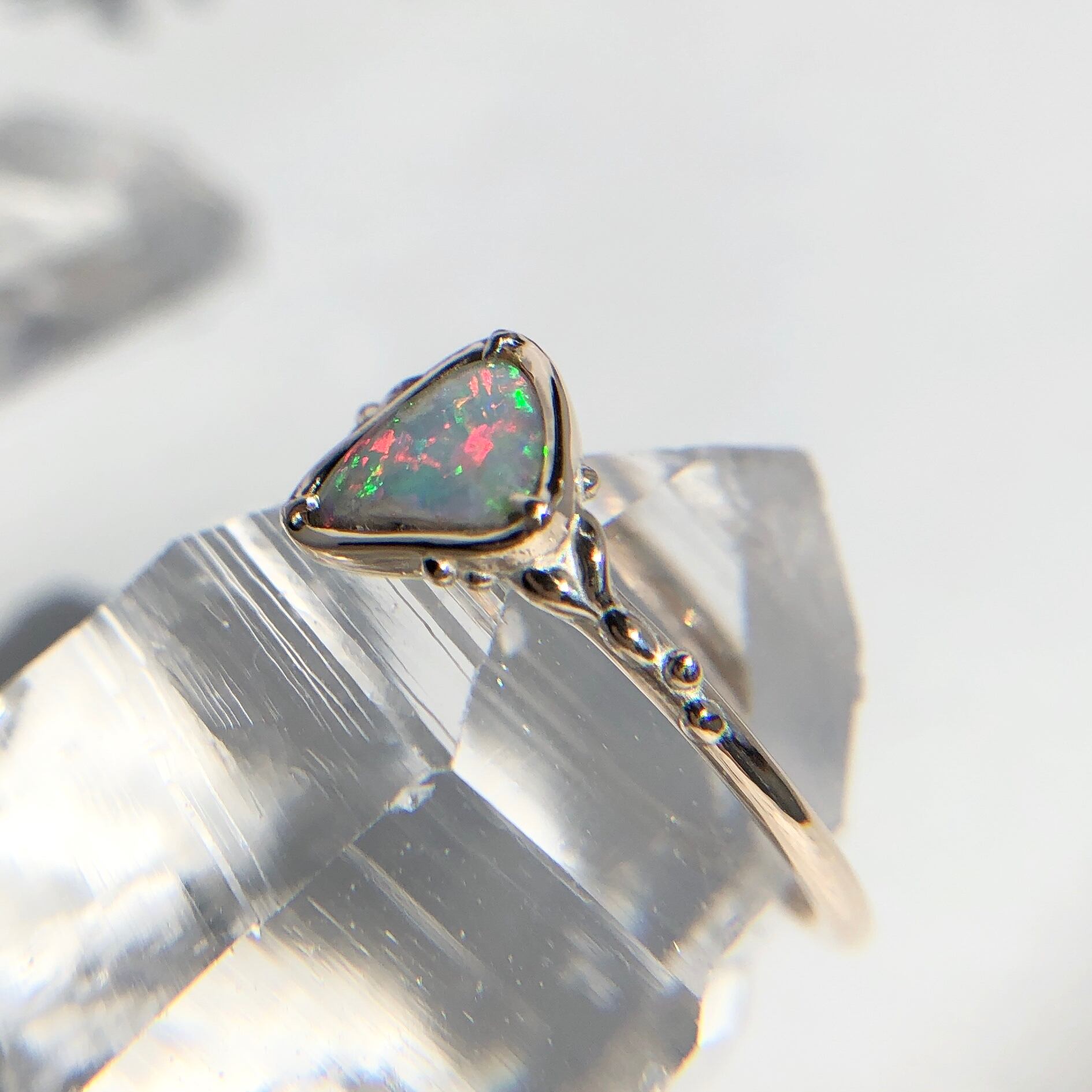 三角形のオパールはシンプルな爪留めにして、アームには金の粒の飾り付けでアシンメトリーな華奢な可愛いリングになりました。