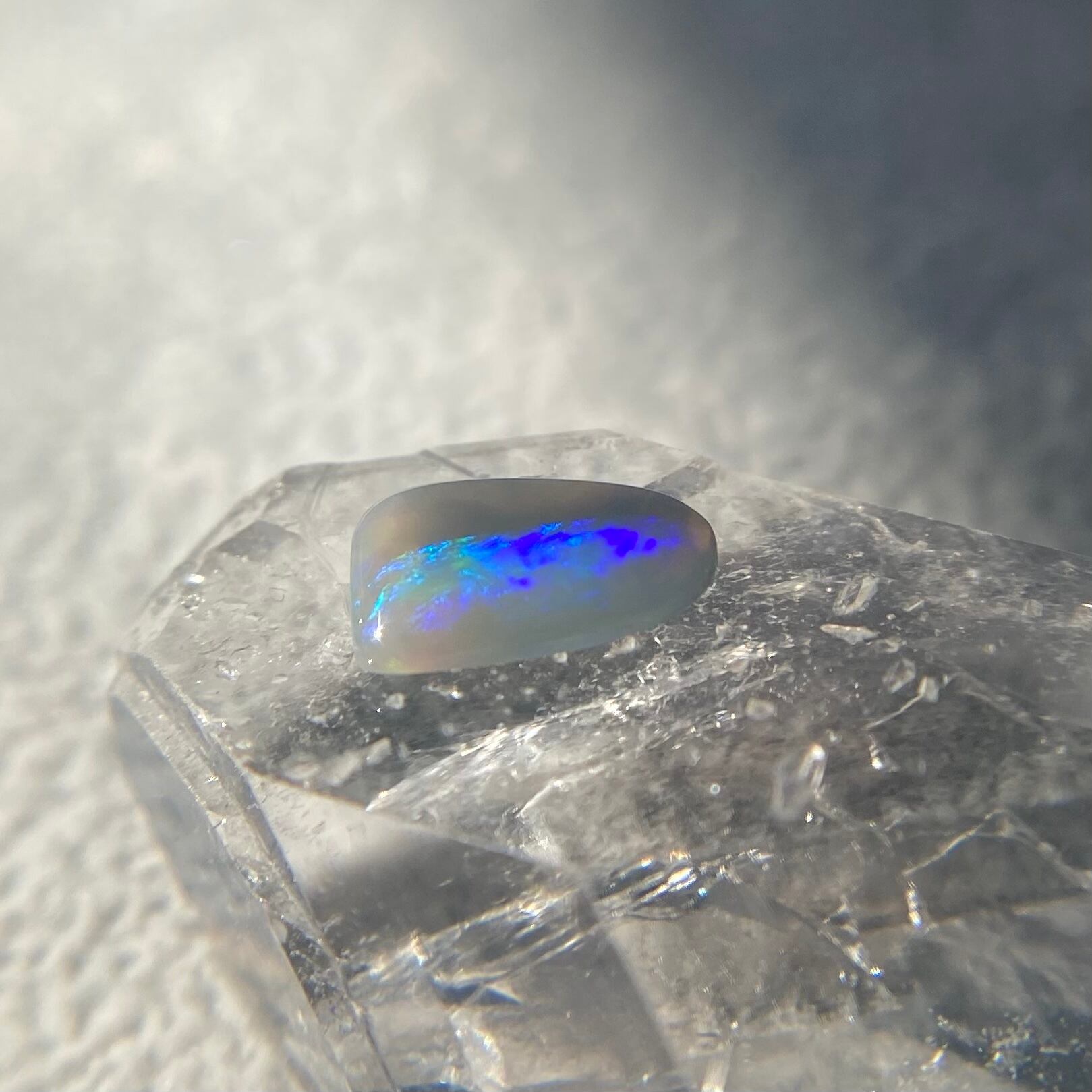 ブラックオパールのグレーカラーのベースと透明感のあるクリスタルオパールの中に浮かび上がる、7色の遊色がきらめいてとても美しく魅力的です。形も個性的で1点ものジュエリー制作にオススメなルースです。裏面にも遊色がきらめきます。