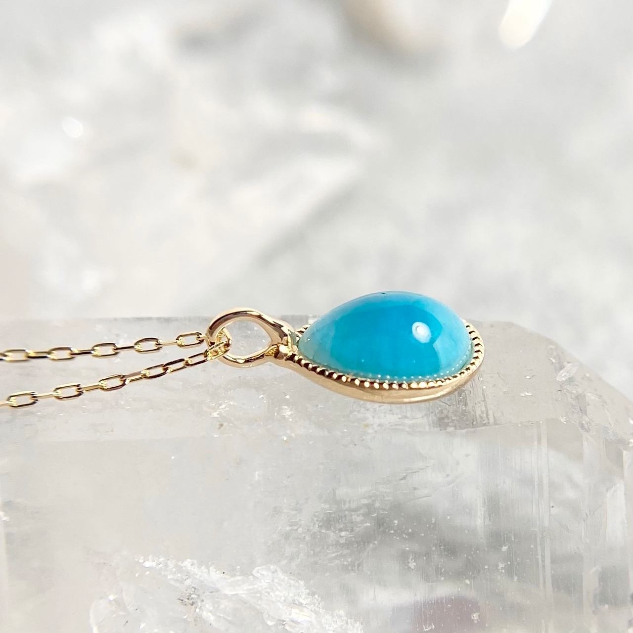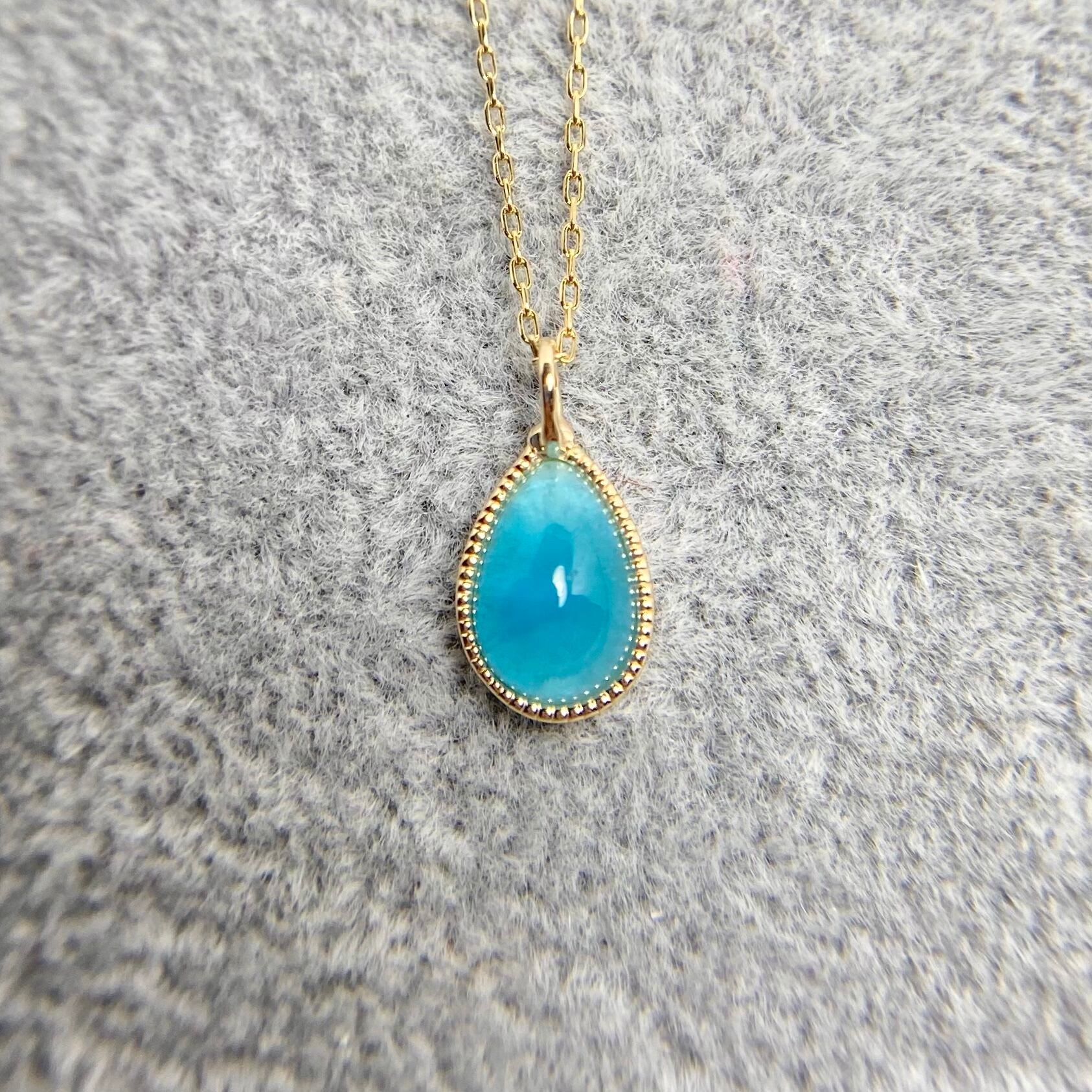 青色がきれいなヘミモルファイト原石を雫型に磨いてネックレスを作りました。