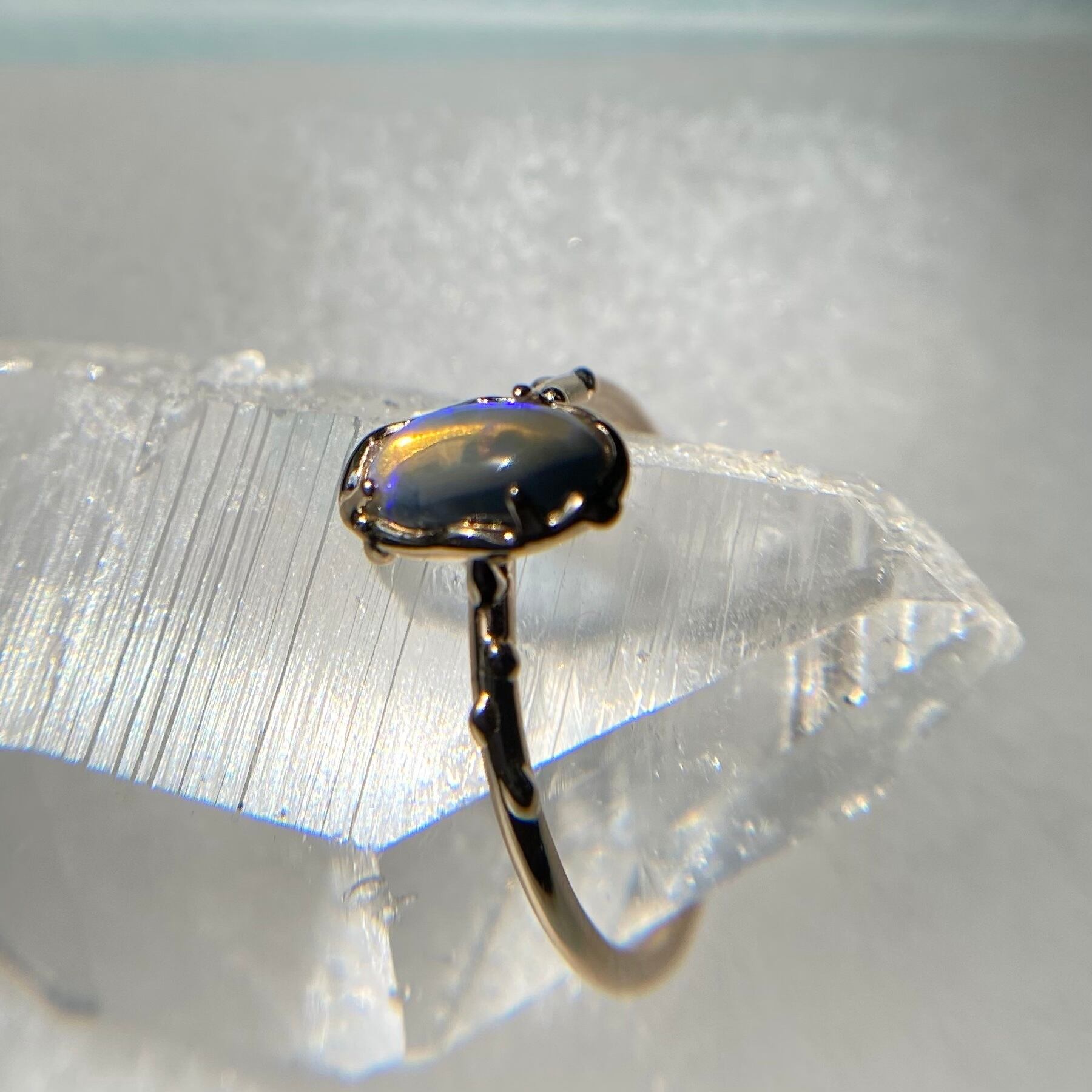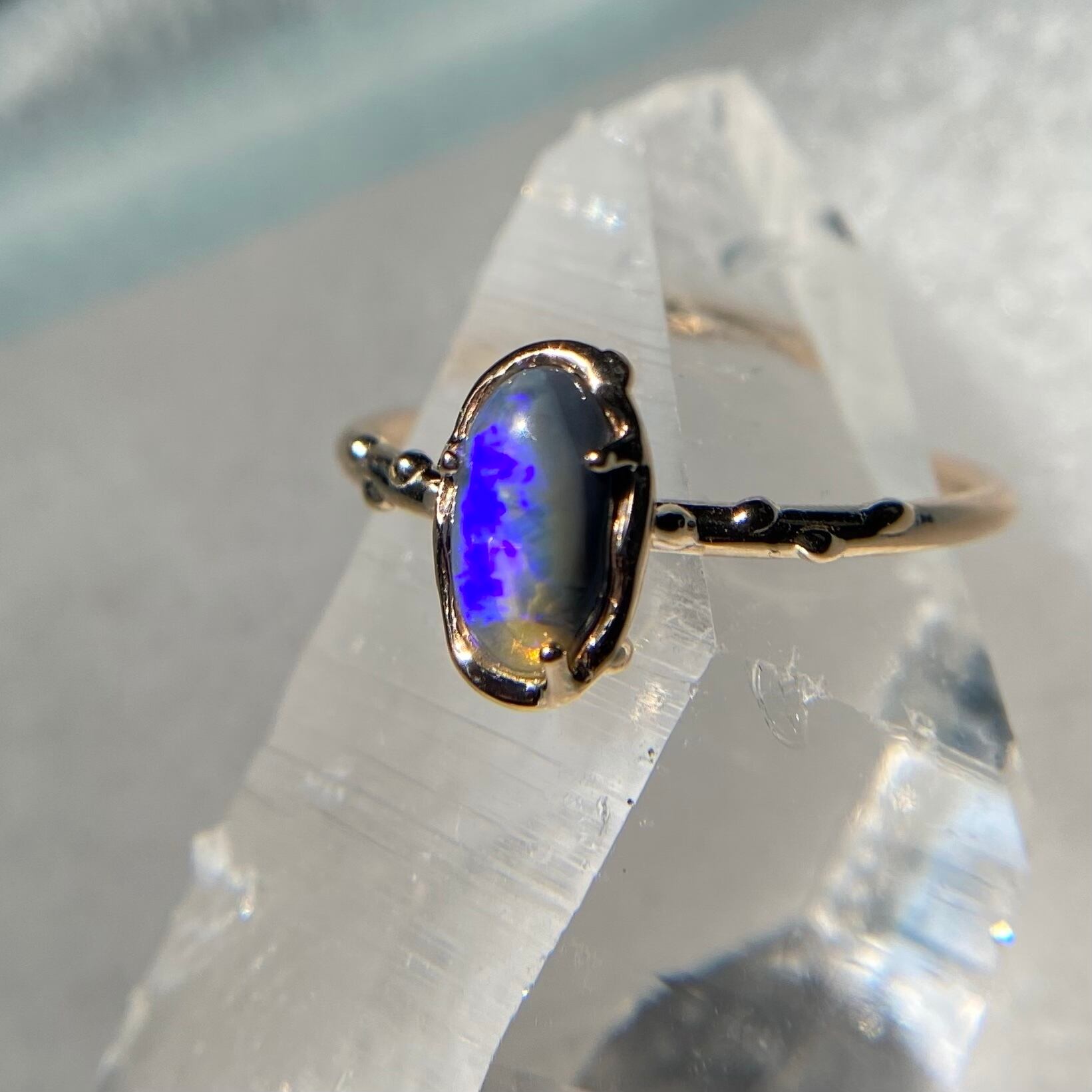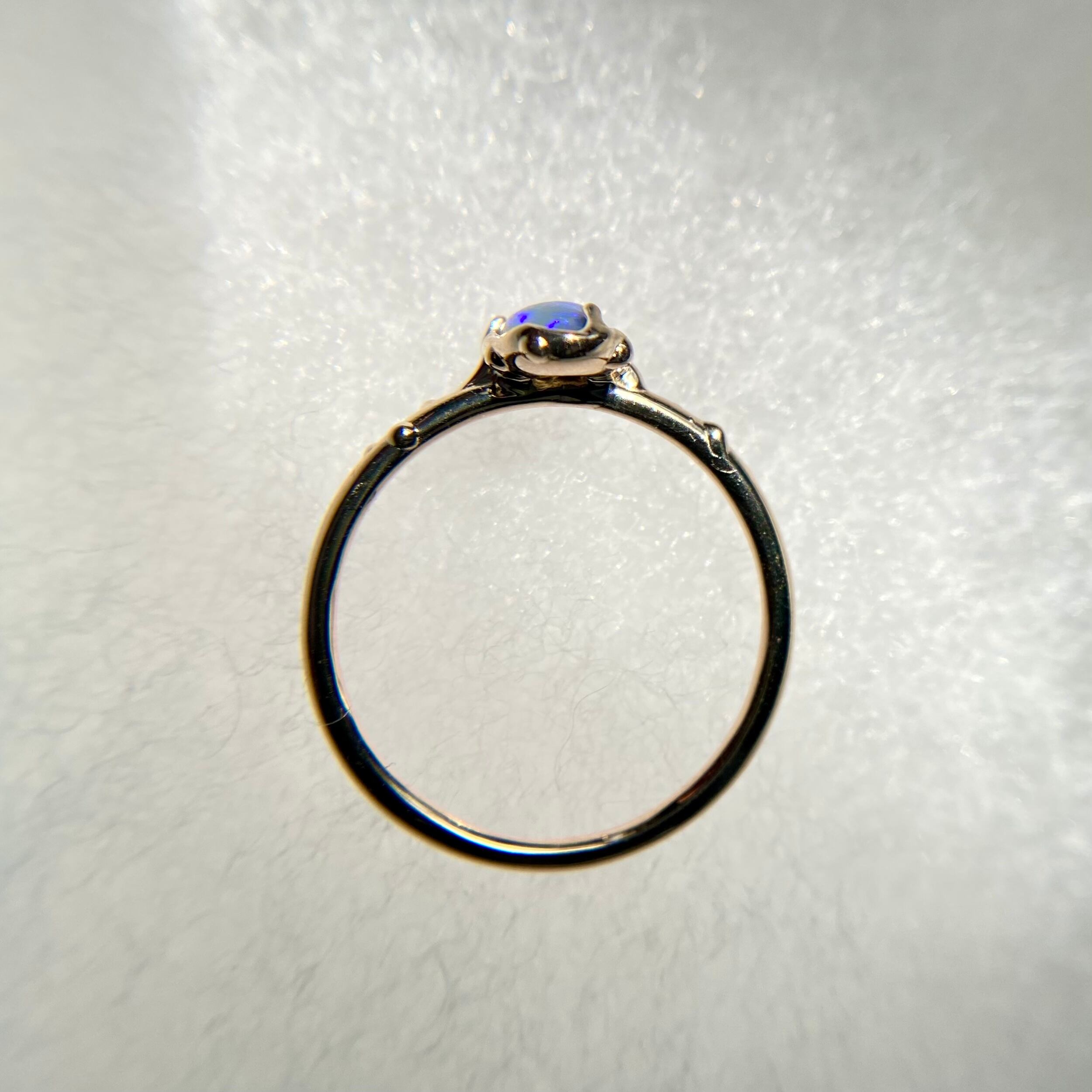 このリングに使われているオパールは、オーストラリアのLightning Ridge産の原石から磨かれた1点もの。