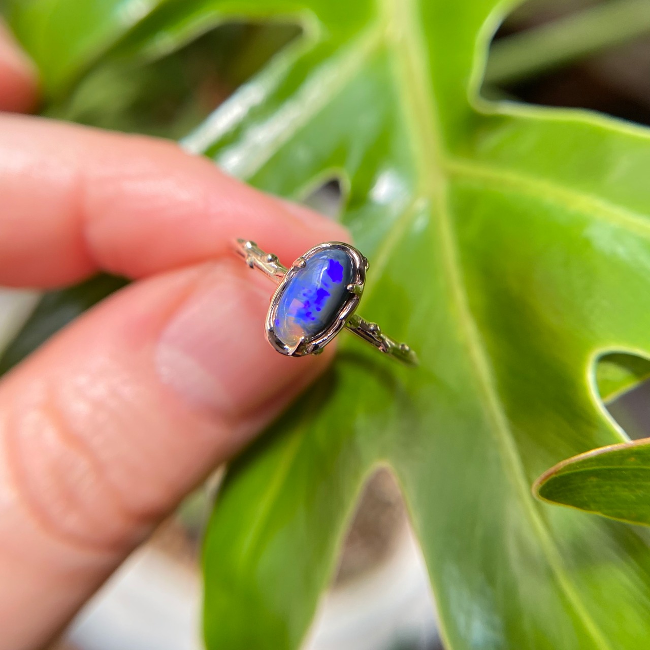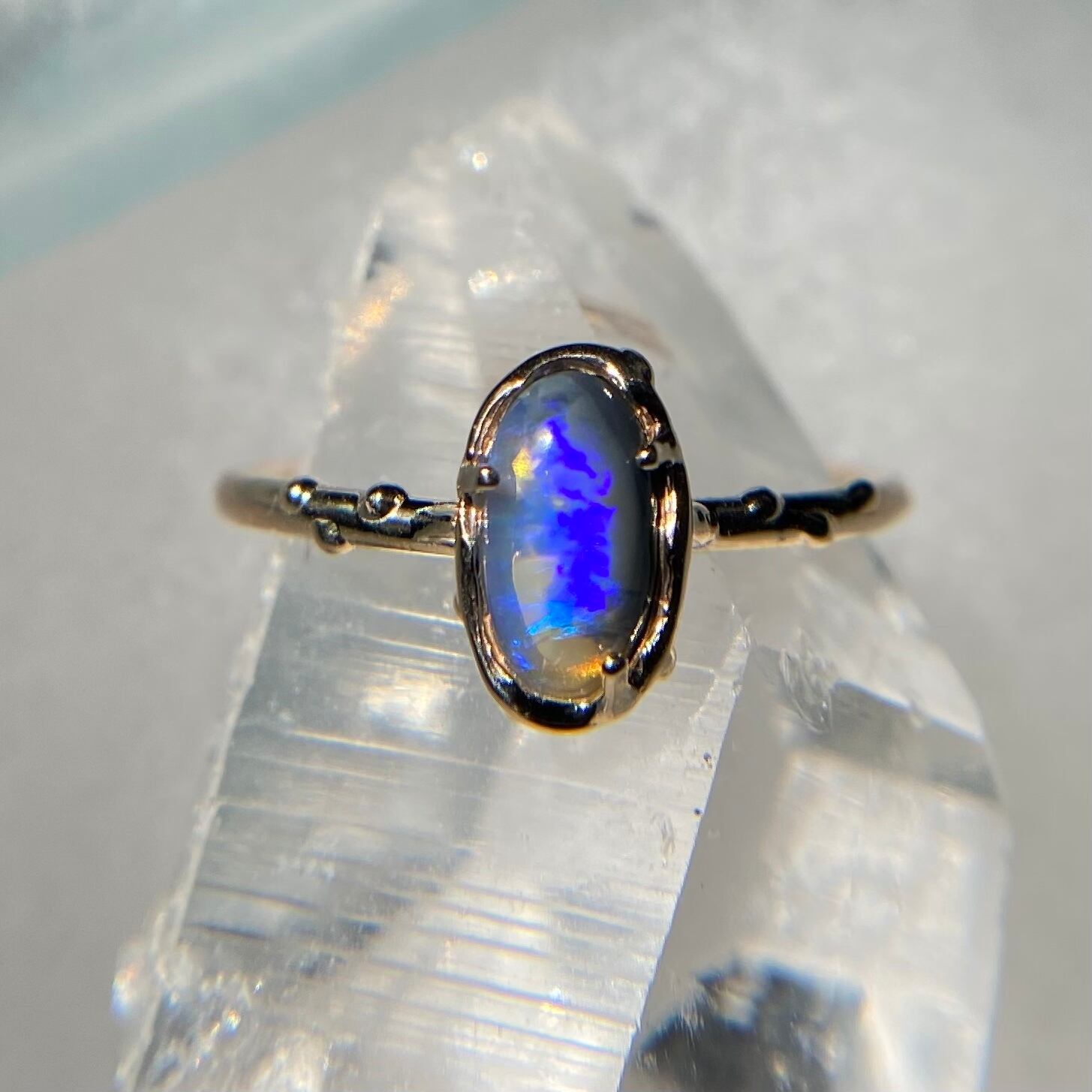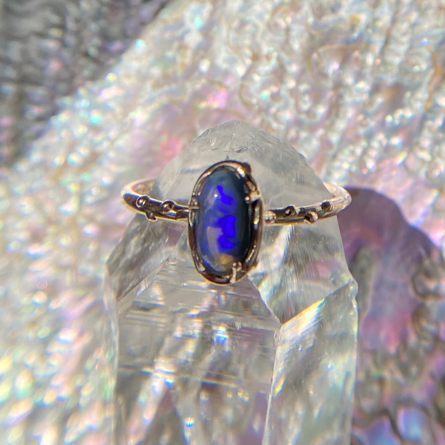このリングに使われているオパールは、オーストラリアのLightning Ridge産の原石から磨かれた1点もの。