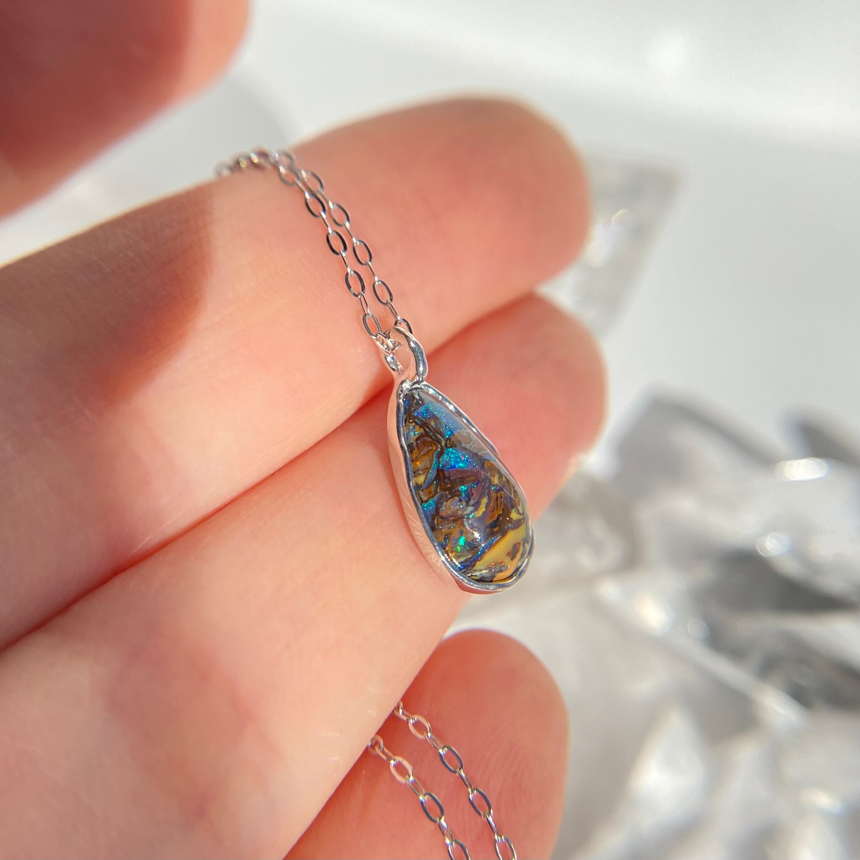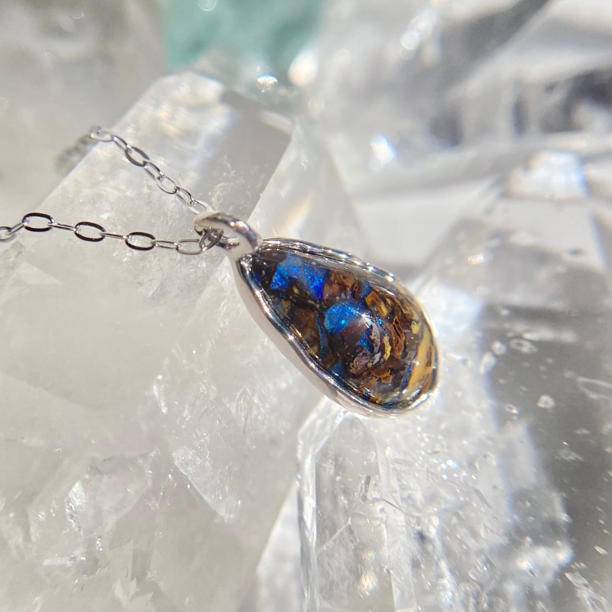 オーストラリア、Yowah産のボルダーオパール原石を雫型に研磨して、海の波をイメージした石枠デザインで可愛い雰囲気のオパールネックレスを作りました。