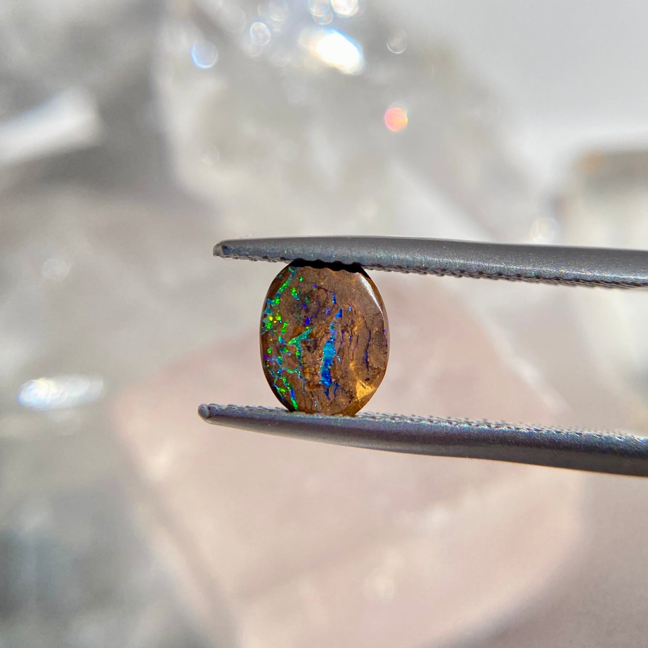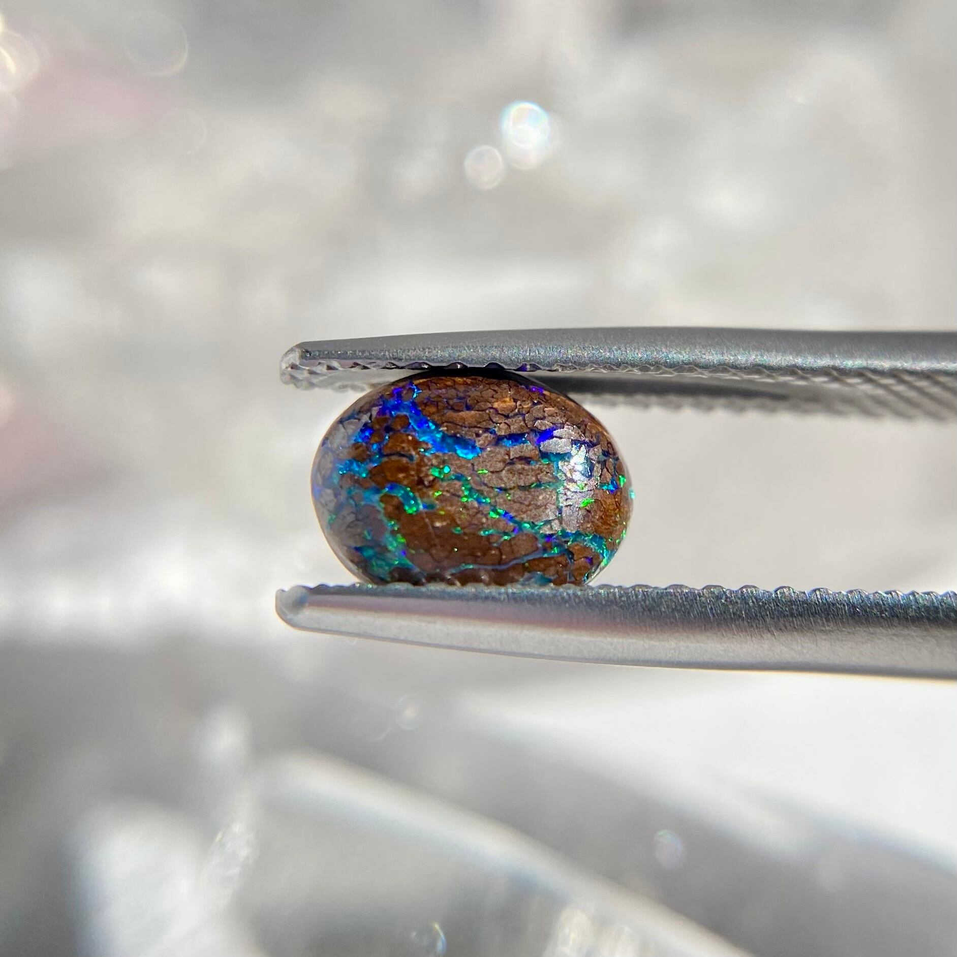 母岩の茶色の中に緑、青色の遊色が美しく煌めき素敵なボルダーオパールです。