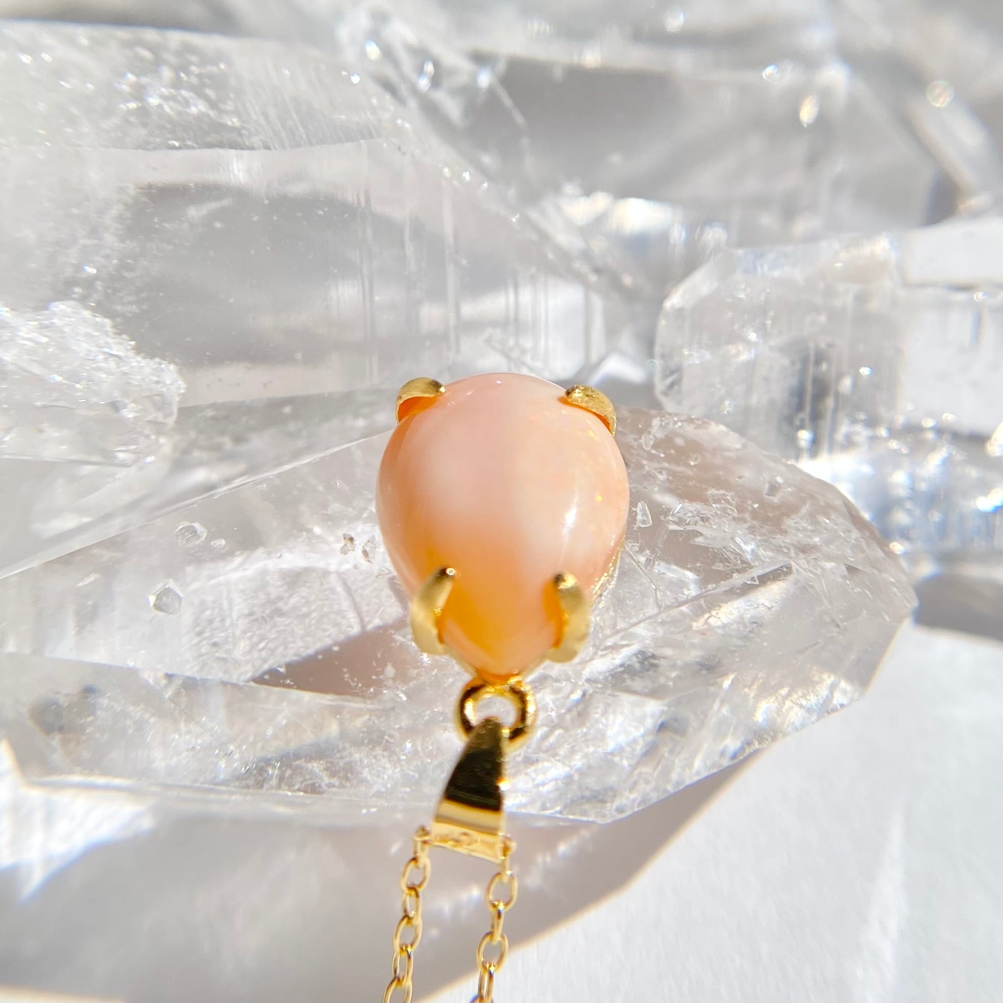 淡いオレンジカラーに、ミルキーカラーの模様がオーロラのように広がり、画像ではわかりにくいですが左側に、オレンジ、黄色の遊色がキラキラと煌めく素敵なオパールです。