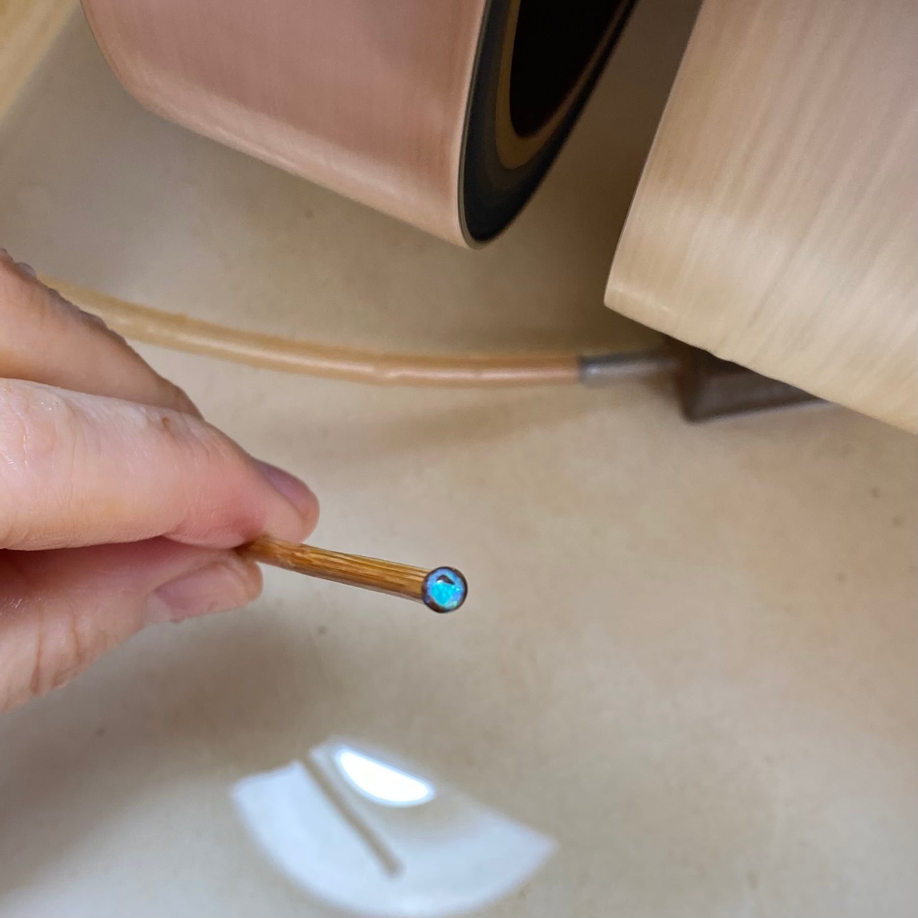 ダークブラウンのベースに浮かぶ緑と青の遊色が、見る角度によって様々な表情を見せます。