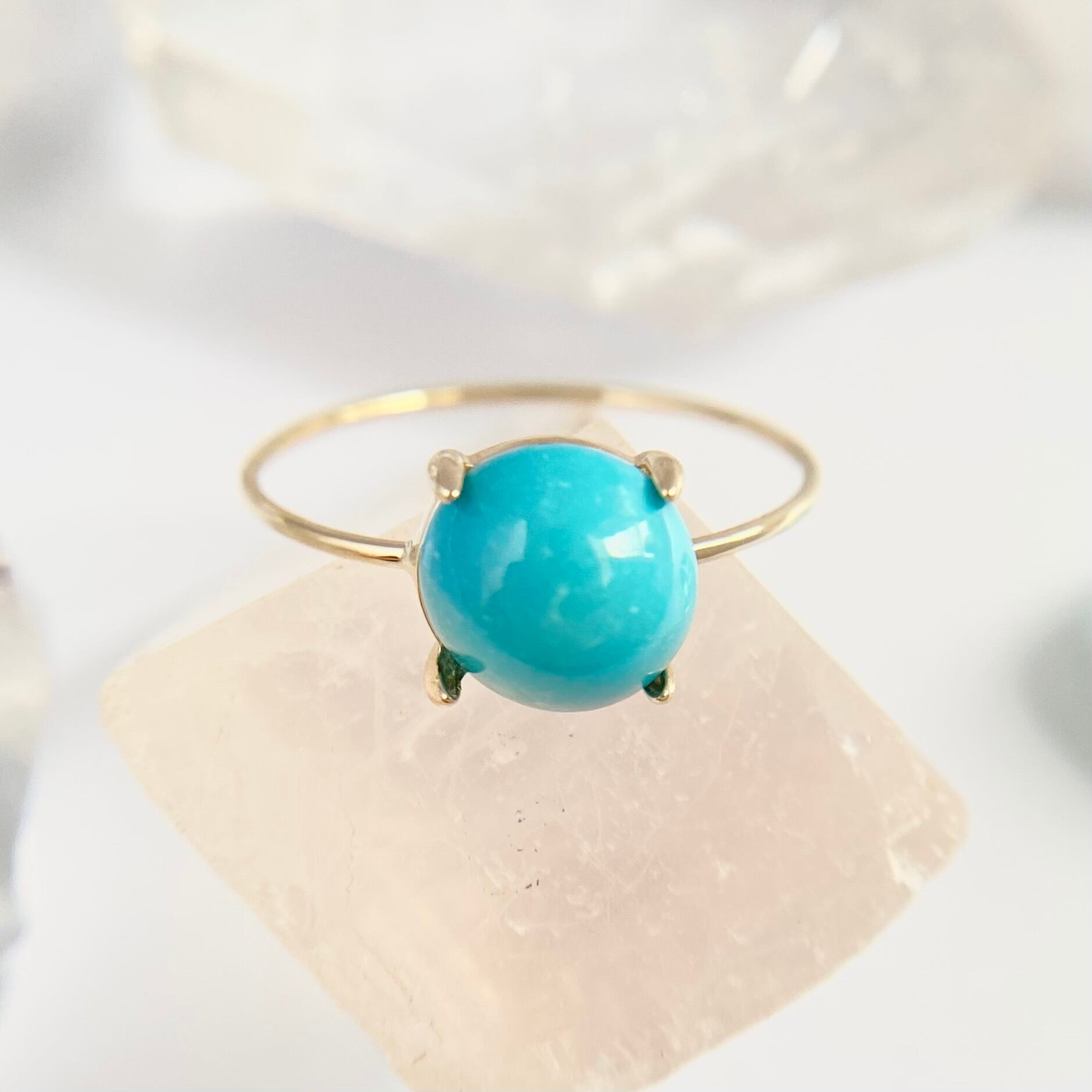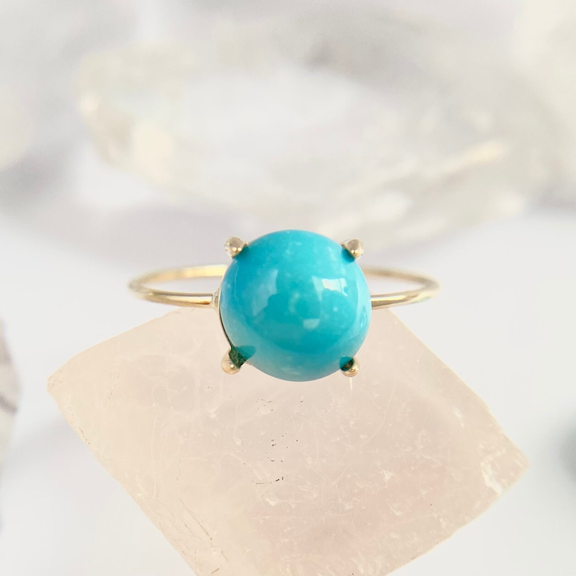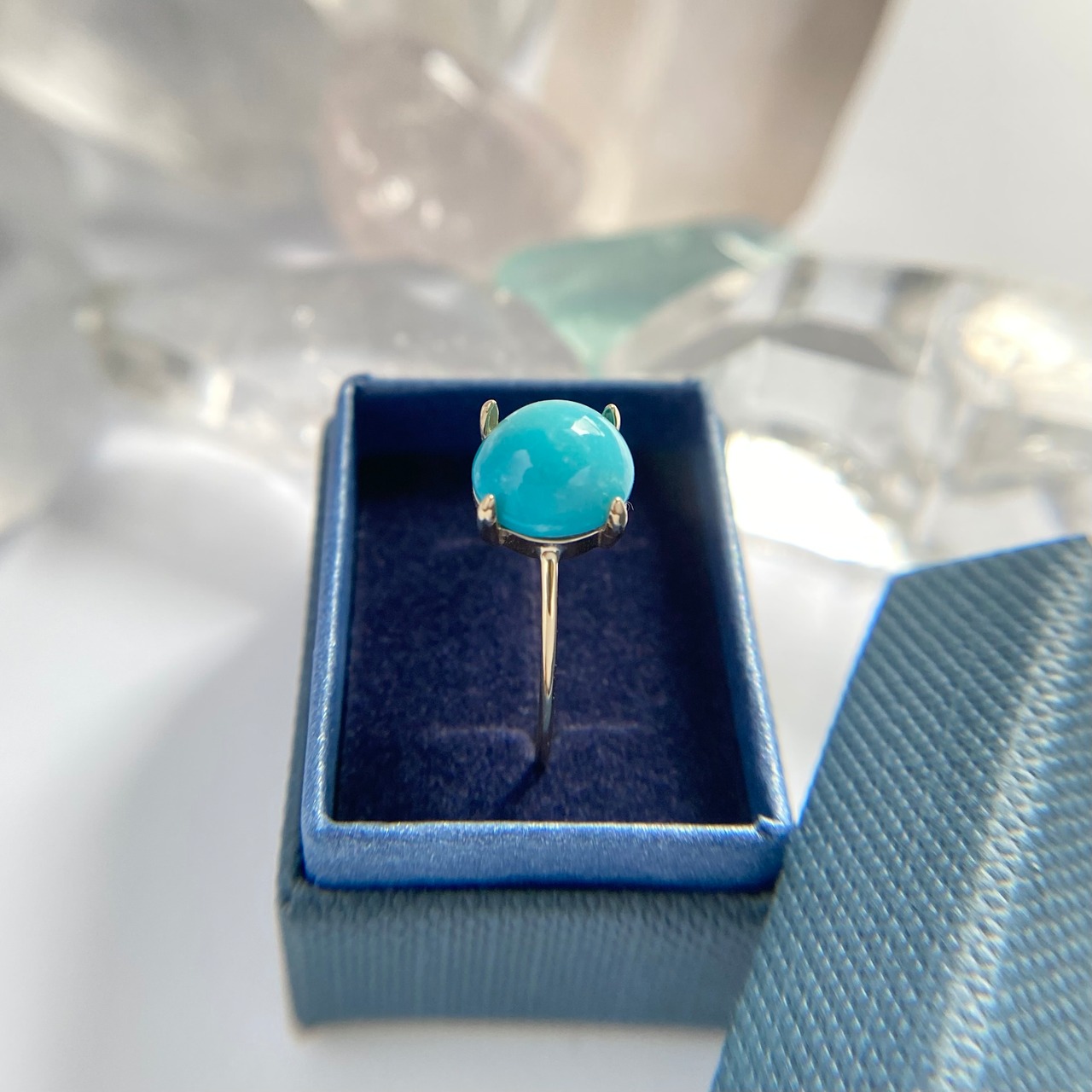 天然トルコ石(ターコイズ)K10リングは、スリーピングビューティー産の原石から丁寧に磨かれた1点ものジュエリーです。