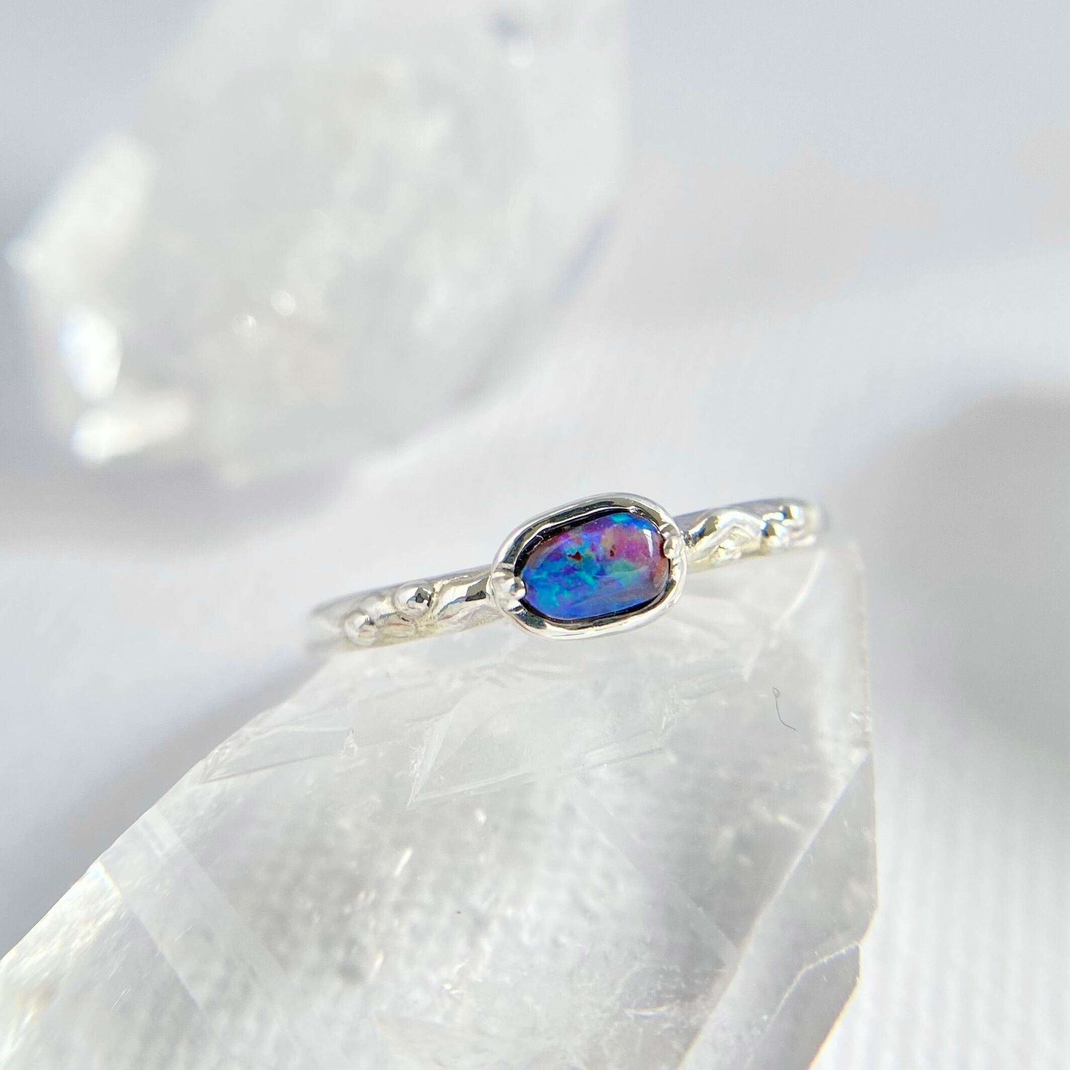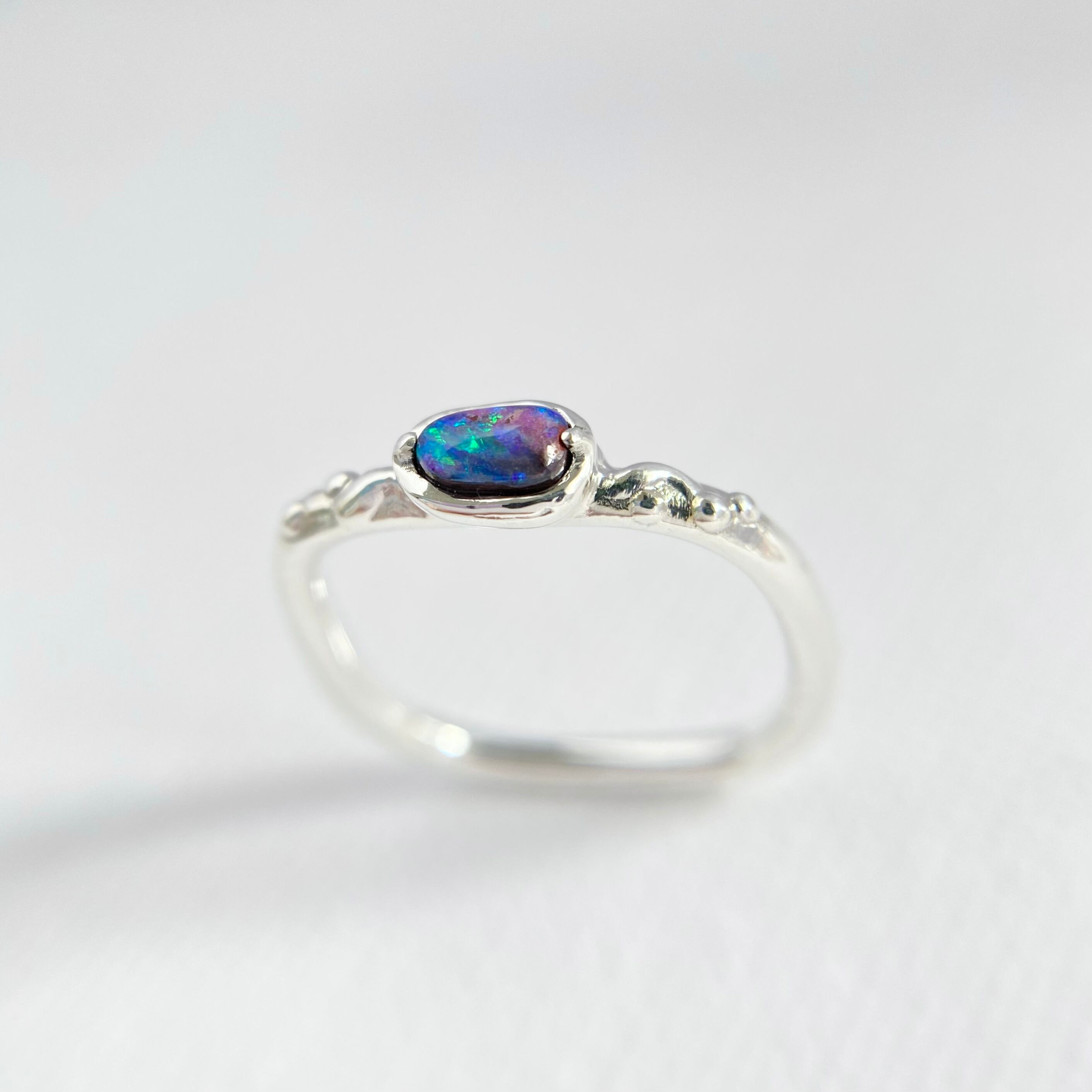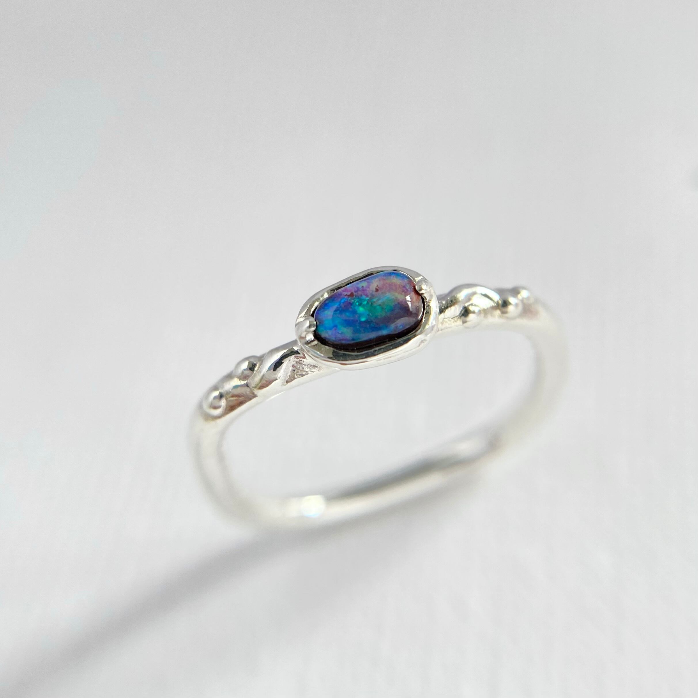 天然オパールは見る角度によって遊色が変わり、楽しい石です。太陽光の下でリングを動かして遊色の変化をお楽しみ下さい。