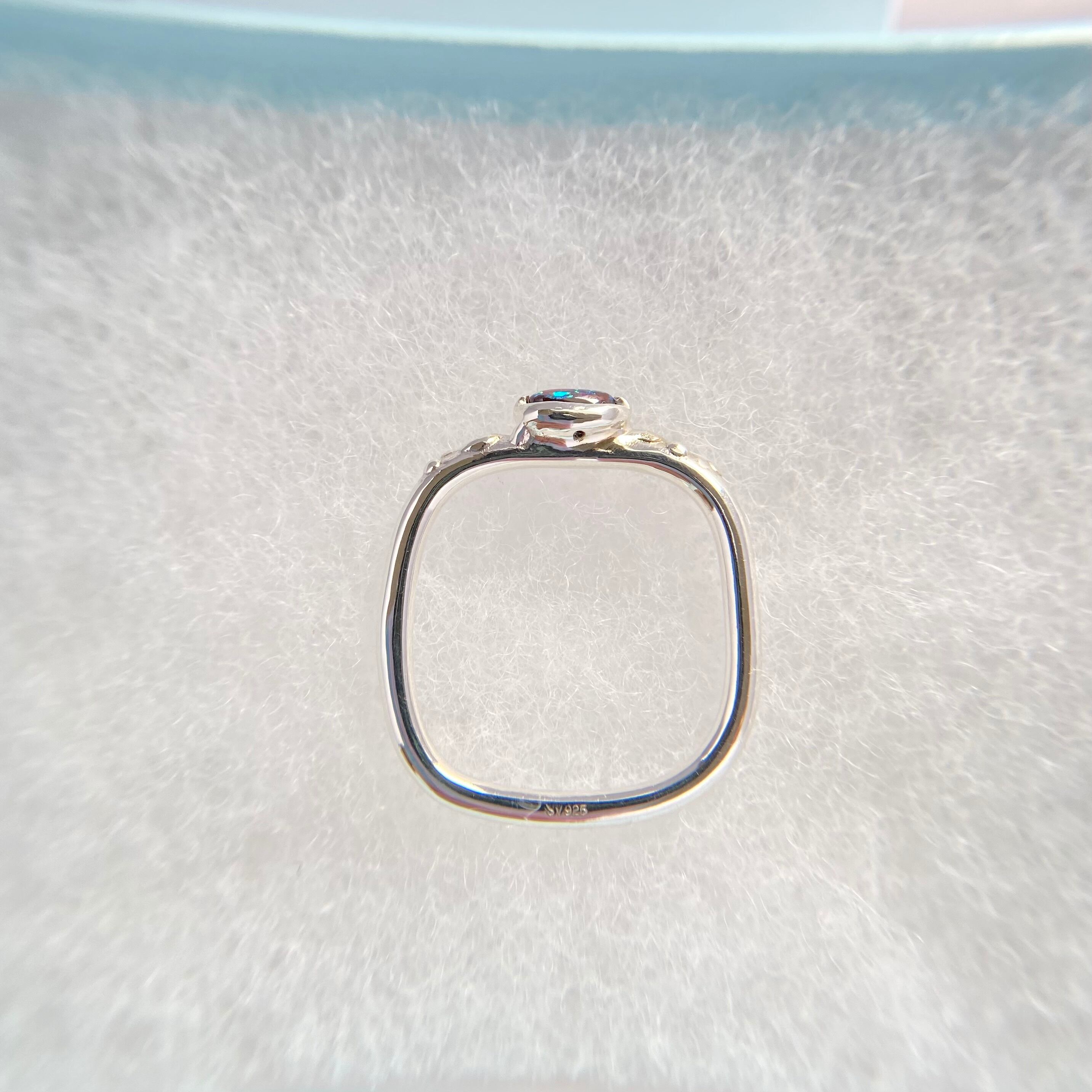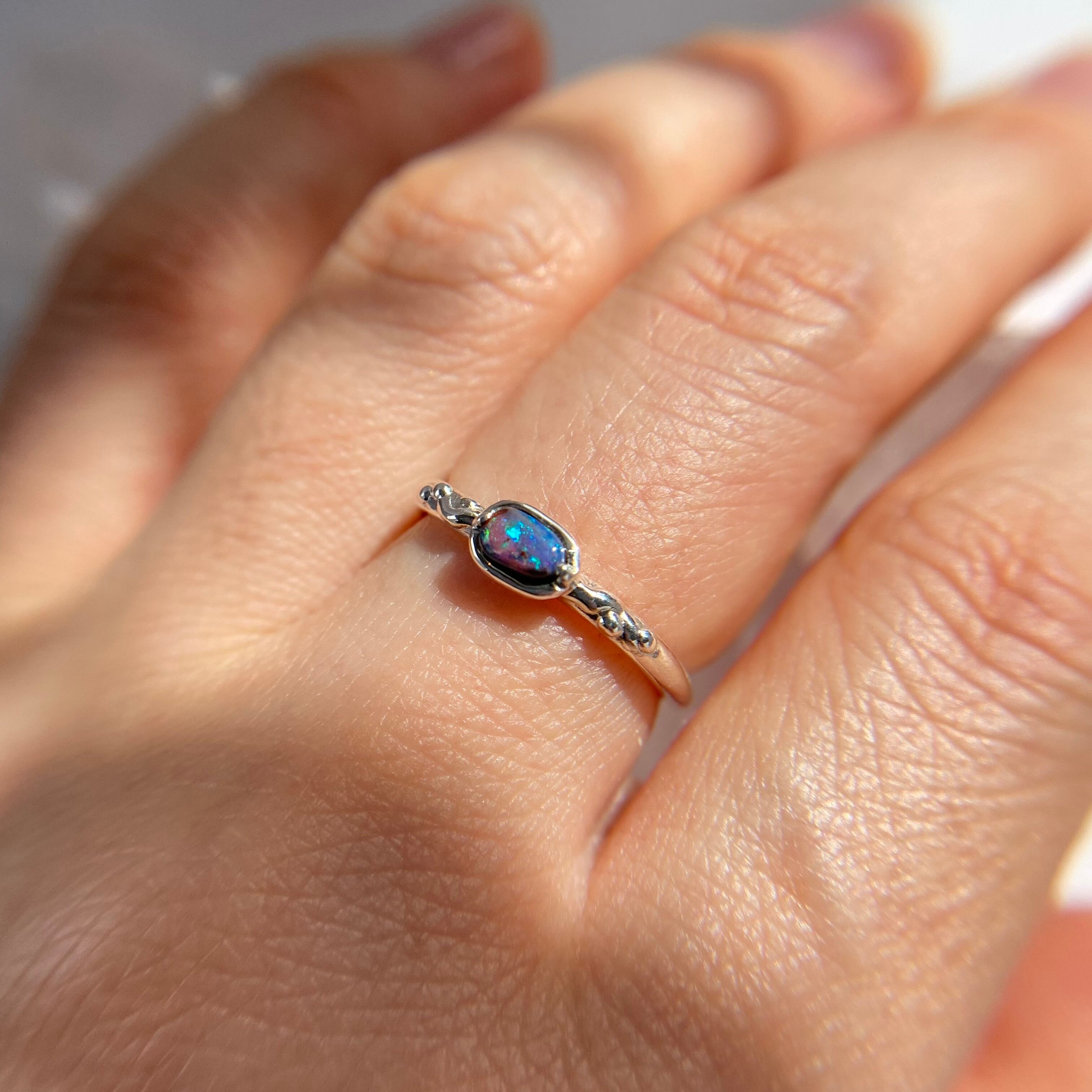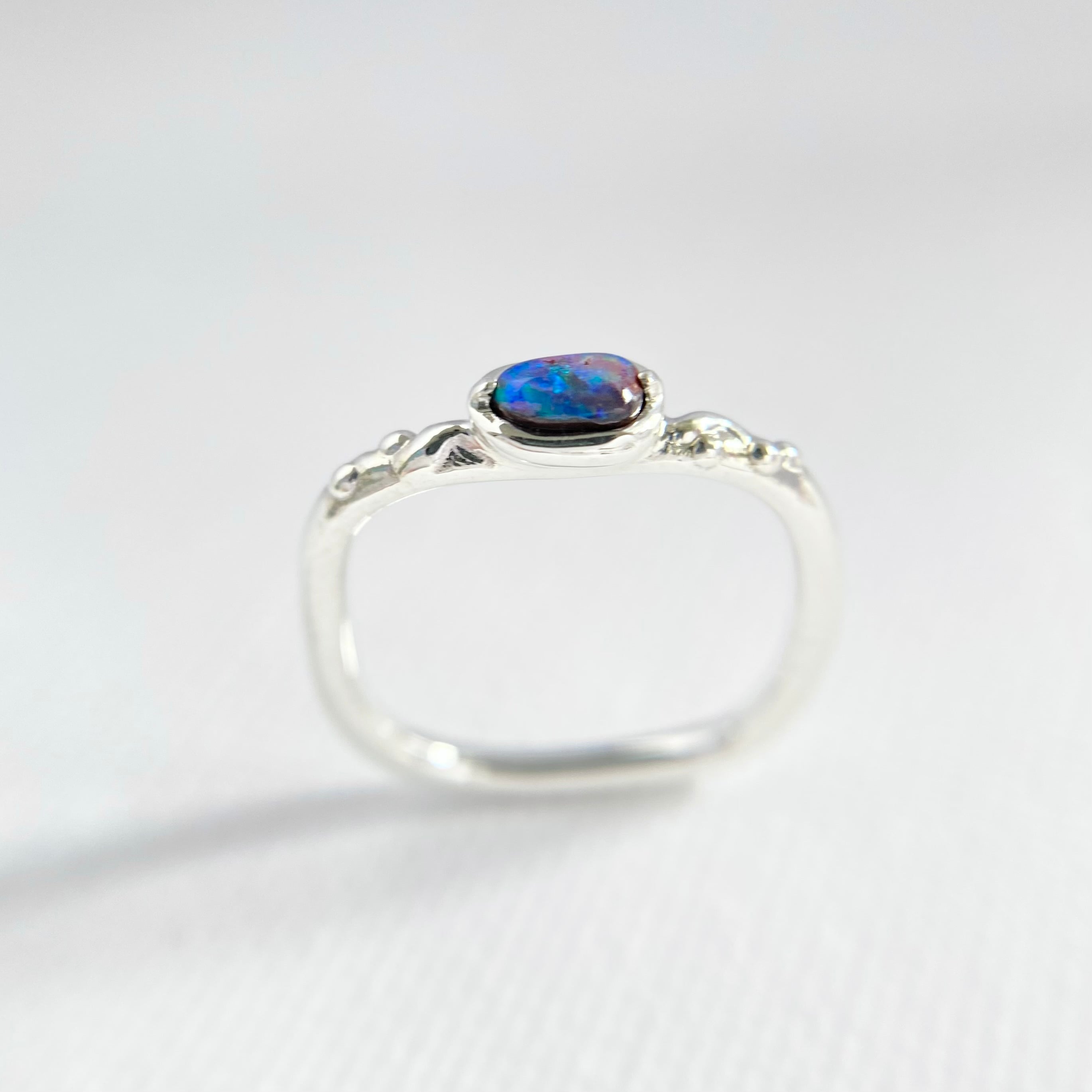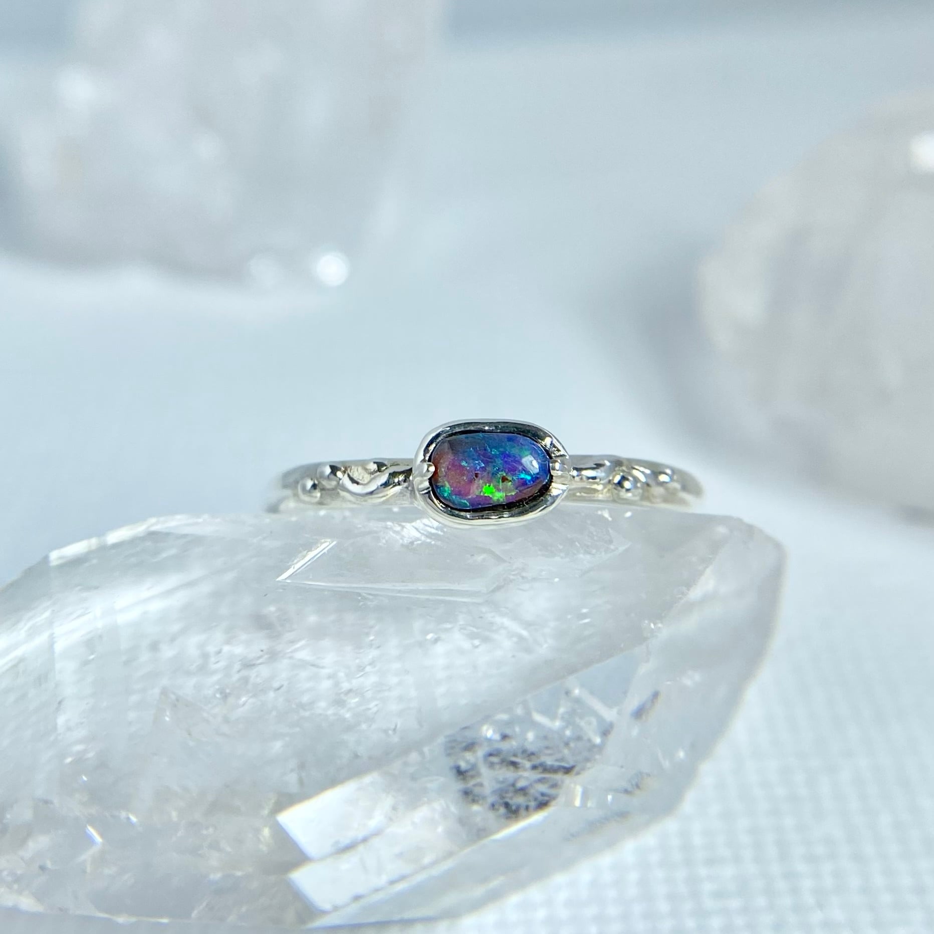 天然オパールは見る角度によって遊色が変わり、楽しい石です。太陽光の下でリングを動かして遊色の変化をお楽しみ下さい。