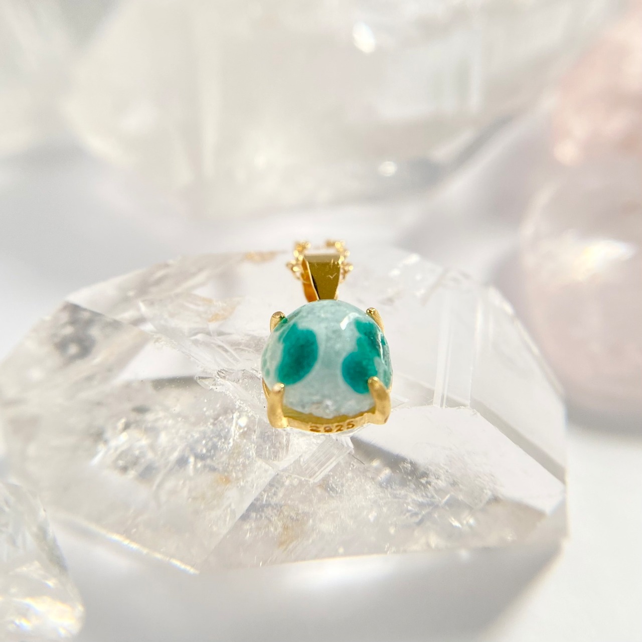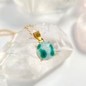 きらきら反射するドゥルージーの結晶部分が少しあり、透明なクォーツの中に青緑色の斑点模様がとても可愛い天然クリソコーラクォーツです。