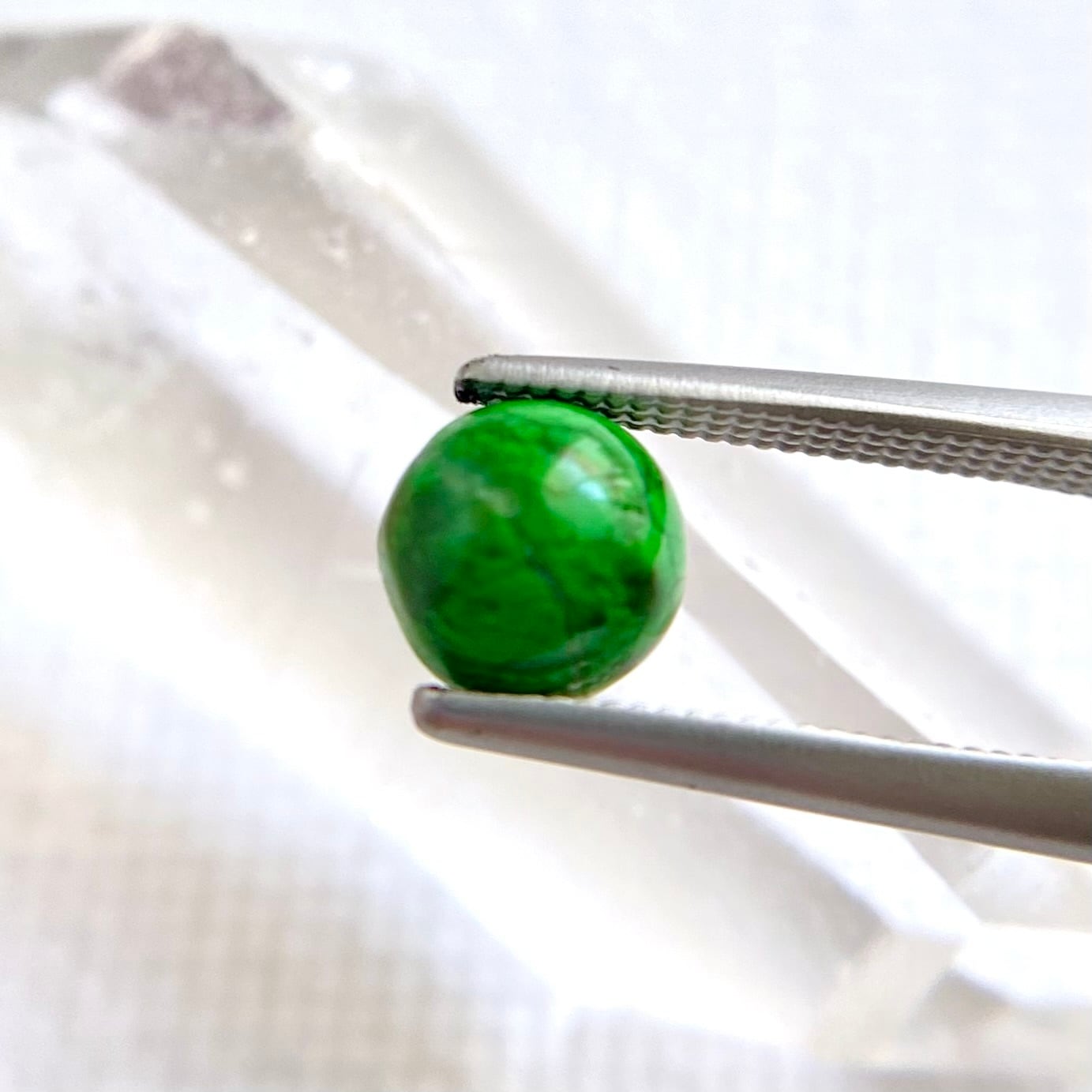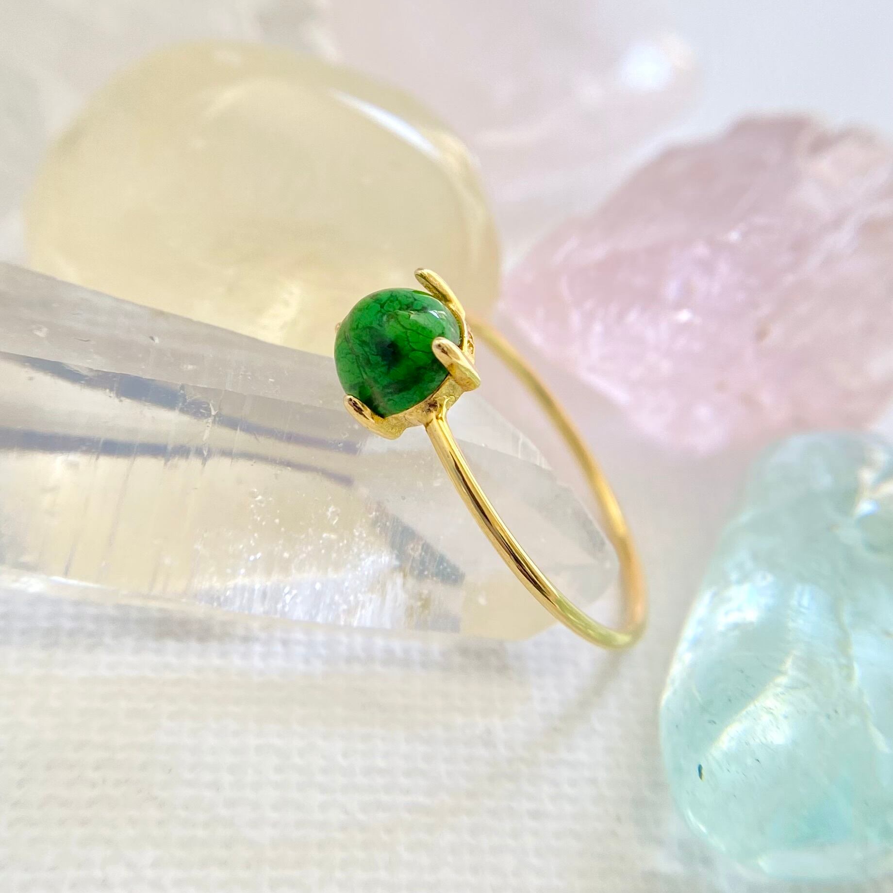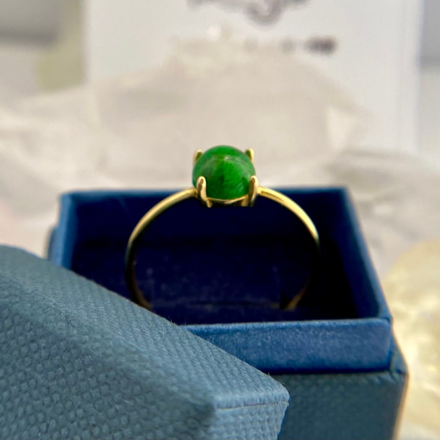 ミャンマー産の天然コスモクロア原石をカボションカットラウンドに研磨して、シンプルなリングを作りました。